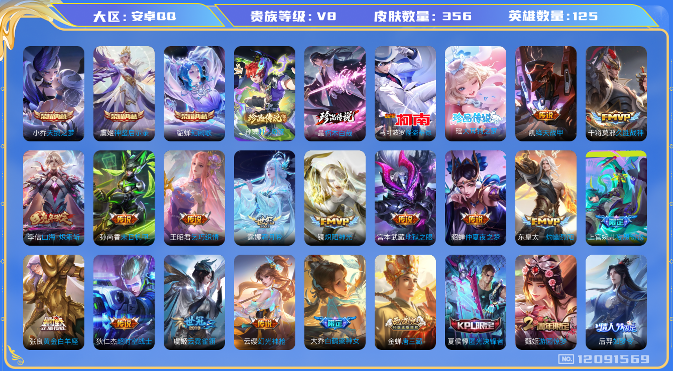[12091569]V8 3典藏 4珍品传说 19传说 125英雄 356皮肤 可修改实名 优质装备:天鹅之梦(小乔典藏),幻阙歌(貂蝉典藏),神鉴启示录,怪盗基德,大耳狗之梦,朽木白哉,绛天战甲(鸡嘴战神),黄金白羊座,久胜战神,炽阳神光,云霓雀翎,末日机甲-孙尚香(绿蚂蚱),仲夏夜之梦(大飞蛾),地狱之眼,乞巧织情,超时空战士-狄仁杰,山海·炽霜斩(李信年限),灼幽烈阳,妄想奇谈,霜月吟 珍品传说:时之奇旅-孙策 传说皮:幻光神枪 珍宝阁皮:优雅恋人,蔷薇恋人 限定皮:愿照·众生和(妲己年限),愿照·千秋盛(女娲年限),映山客,白鹤梁神女,遇见飞天,匿光决锋者,五谷丰年,游园惊梦,梁祝,李小龙,逐梦之光,辉光之辰,如梦令-后羿,大圣娶亲,美猴王,玉兔公主,唐三藏,时之奇旅-妲己 史诗皮:赞萌露比,鸭鸭历险记-刘禅,器灵·浮梦炉,狼魂孤将,化蝶舞,星界战将,龙之律动,百相守梦-周瑜,茶境仙,幻珠鲛人,怒海争锋,琥珀纪元伽罗,蔬乡物语(鲁班七号),百相守梦-百里守约,百相守梦-黄忠,织梦人,遇见神鹿,紫霞仙子,苍穹之光,电玩小子(小书包),黄金分割率,特工魅影,千年之狐,江河有灵,匿光侦查者,魅语,蒙恬荣光圣徽,冰冠公主,青蛇,偶像歌手,白蛇,电玩·爆裂旋风,百相守梦(刘备),龙骑士(小龙虾),末日机甲-吕布,猫狗日记-孙策,猫狗日记-大乔,乱世虎臣,节奏热浪,女仆咖啡,摇滚巨星,水果甜心,绅士熊喵,天才门将,星夜王子,心灵骇客,时之奇旅-安琪拉,功夫厨神,德古拉伯爵,暗隐猎兽者,幽灵船长,鬼剑武藏,心灵战警,舞动绿茵,地狱岩魂,诗语江南,纤云弄巧,繁星吟游(呼啦呼啦),缤纷独角兽,乘风破浪,逐浪之夏,月团寄思,水晶猎龙者,曙光守护者,箭羽风息,金属风暴,圣诞狂欢,圣诞恋歌,鹰眼统帅,暗夜贵公子,魅力维加斯,黎明之约,奇遇舞章,天秀·音浪,未来纪元-赵云