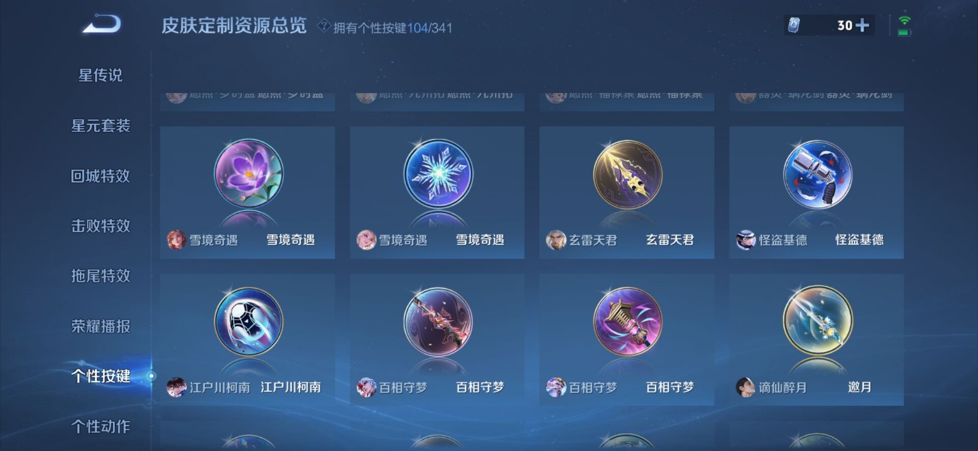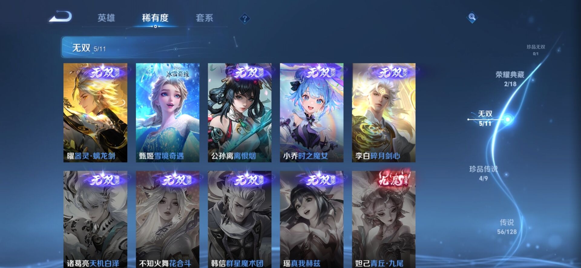 夏侯惇霜北刀,黄忠烈魂,甄姬幽恒,铠青龙志,盾山梦圆繁星,伽罗太华,赵云百木心枪,干将莫邪冰霜恋舞曲,典韦岱宗,不知火舞绯月行,牛魔奔雷神使,项羽霸王别姬,后羿无尽星芒,吕布御风骁将,后羿如梦令,后羿辉光之辰,庄周玄嵩,诸葛亮时雨天司,公孙离祈雪灵祝,司空震愿照·山河定,裴擒虎李小龙,上官婉儿梁祝,李白诗剑行,安琪拉魔法小厨娘,马可波罗山海·玄木吟,马可波罗深海之息,桑启鸣野蒿,女娲愿照·千秋盛,芈月白晶晶,孙悟空至尊宝,百里玄策白虎志,赵云引擎之心,妲己愿照·众生和,百里守约朱雀志,蔡文姬愿照·福禄聚,瑶山海·碧波行,澜愿照·九州拓,虞姬霸王别姬,虞姬愿照·岁时盈,娜可露露前尘镜,王昭君凤凰于飞,嫦娥如梦令,橘右京枫霜尽