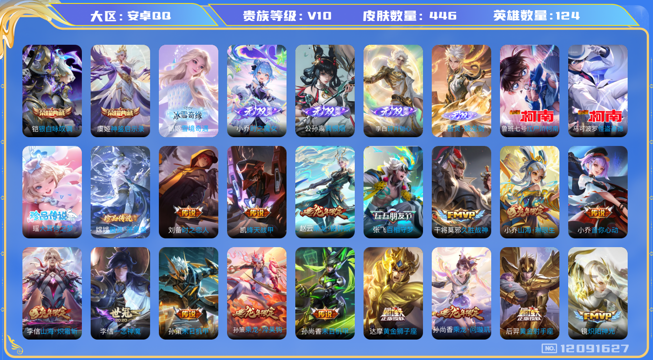 [12091627]V10 2典藏 5无双 4珍品传说 56传说 124英雄 446皮肤 可修改实名 优质装备:银白咏叹调(倪克斯侍卫),碎月剑心(李白无双),神鉴启示录,小乔时之魔女(小乔无双),离恨烟(公孙离无双),雪境奇遇-甄姬,器灵·螭龙剑,江户川柯南,怪盗基德,器灵·落星盏,大耳狗之梦,黄金狮子座,黄金射手座,冠军飞将,云鹰飞将(小将军),绛天战甲(鸡嘴战神),久胜战神,炽阳神光,一念神魔,云霓雀翎,末日机甲-孙尚香(绿蚂蚱),音你心动-小乔,地狱之眼,音你心动-周瑜,时之恋人-刘备(电焊工),游龙清影(小青龙),超时空战士-狄仁杰,末日机甲-孙策,无双飞将,神器·狴犴令,山海·炽霜斩(李信年限),山海·琳琅生(小乔年限),山海·苍雷引(电光曜子),浮生妄,百相守梦(张飞),鹤羽星尊,惊梅引,艾琳觅芳踪,玄雷天君 传说皮:乘龙·问璇玑(孙尚香年限),乘龙·铭钟鼎(赵云年限),乘龙·淬吴钩(孙策年限),貂蝉曦玄引,幻光神枪 珍宝阁皮:优雅恋人,蔷薇恋人,玩趣恶龙 限定皮:愿照·九州拓(澜年限),愿照·福禄聚(蔡文姬年限),愿照·岁时盈(虞姬年限),愿照·山河定(司空震年限),愿照·众生和(妲己年限),愿照·千秋盛(女娲年限),鸣野蒿,夏侯惇霜北刀,至尊宝,白虎志(电光耗子),凤凰于飞,太华(伽罗年限),前尘镜,绯月行,魔法小厨娘,白晶晶,时雨天司(水龙头),玄嵩(庄周年限),山海·碧波行(瑶年限),诗剑行,齐天大圣,怒海麟威,五谷丰年,青龙志(铠年限),幽恒(沐浴露),梁祝,御风骁将(吕布年限),烈魂,岱宗(典韦年限),奔雷神使(牛魔年限),祈雪灵祝(雪兔子),李小龙,朱雀志(守约年限),永曜之星,辉光之辰,如梦令-嫦娥,如梦令-后羿,霸王别姬-项羽,霸王别姬-虞姬,引擎之心,天魔缭乱,冰霜恋舞曲,百木心枪,无尽星芒,深海之息(深海大菠萝),枫霜尽,梦圆繁星,山海·玄木吟(马可年限) 史诗皮:鸭鸭历险记-刘禅,苍鳞隐世,器灵·浮梦炉,狼魂孤将,绮世丹青,化蝶舞,灵蛊蚀心,星界战将,谪仙醉月,龙之律动,藏狐·褐绒,茶境仙,怒海争锋,撼地雄心,破空之剑,蒙犽顽岩魄,埋骨钱,蔬乡物语(鲁班七号),曹操夜都魔契,乘龙·聚宝船(安琪拉年限),乘龙·忆丹青(大乔年限),百相守梦-百里守约,紫霞仙子,苍穹之光,电玩小子(小书包),白龙吟,黄金分割率,特工魅影,千年之狐,永昼,末日机甲-