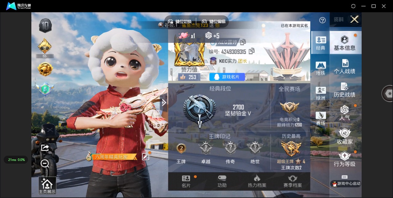- PX_2090106-实名: 可修改 贵族等级: V5 英雄数: 95 皮肤数: 76 传说皮: 澜逐花归海 限定皮: 愿照·众生和,愿照·岁时盈,愿照·福禄聚