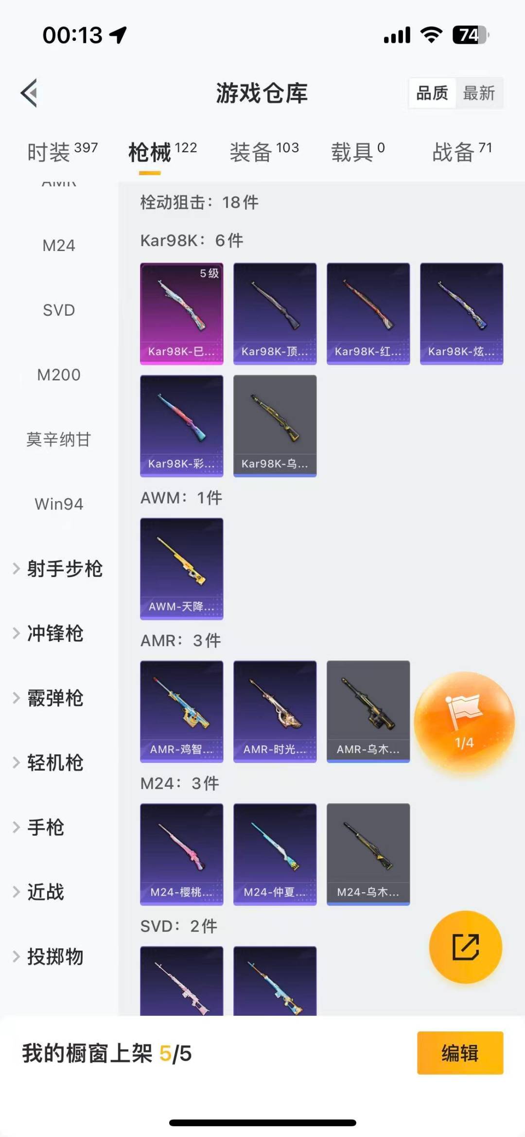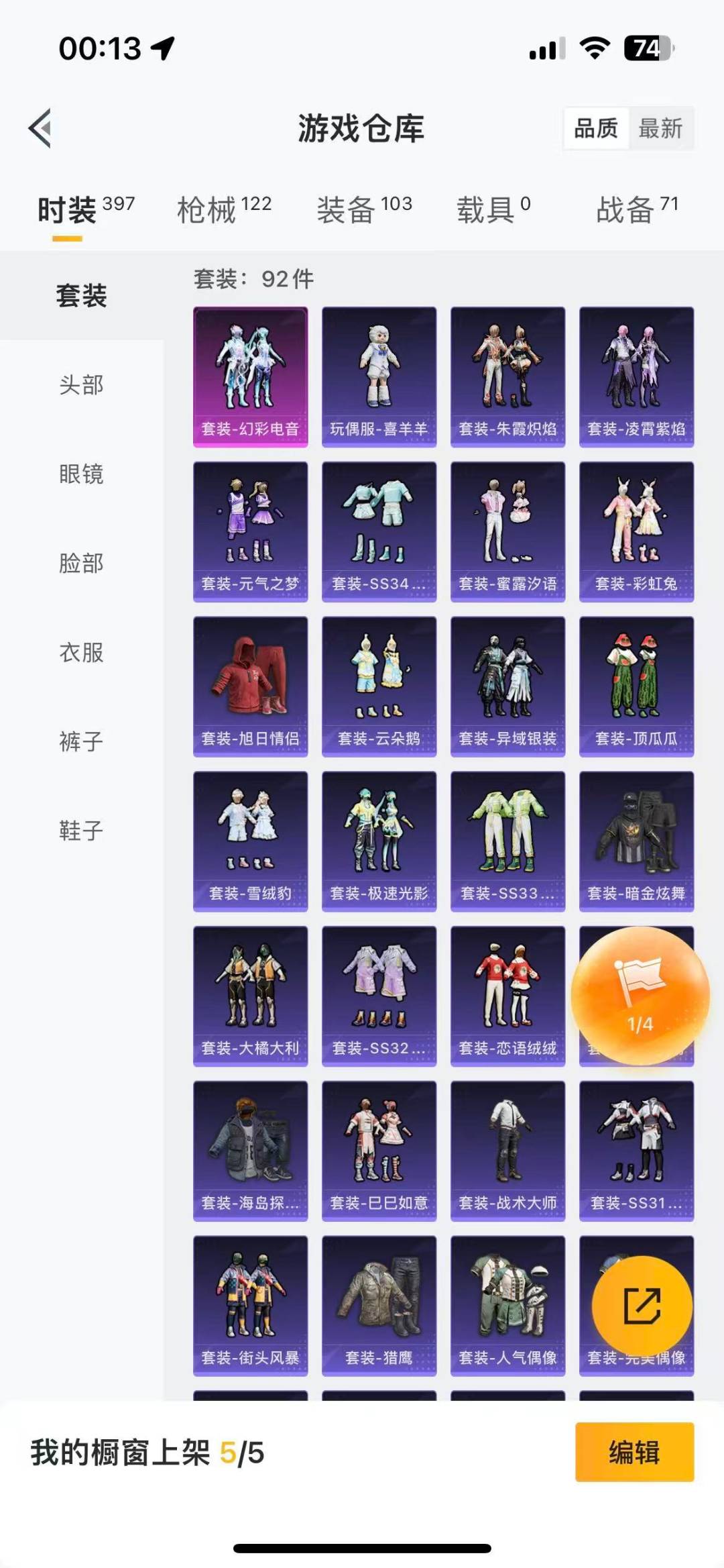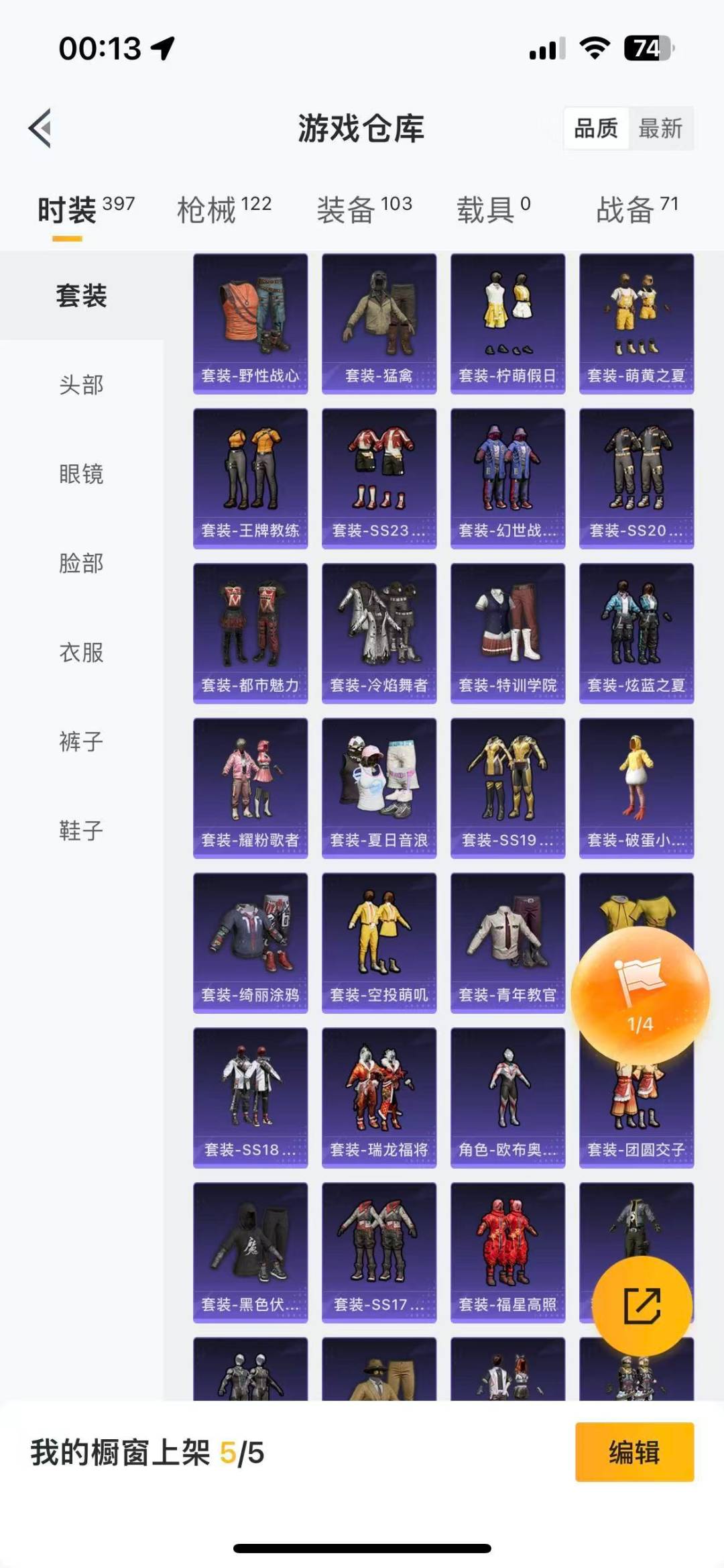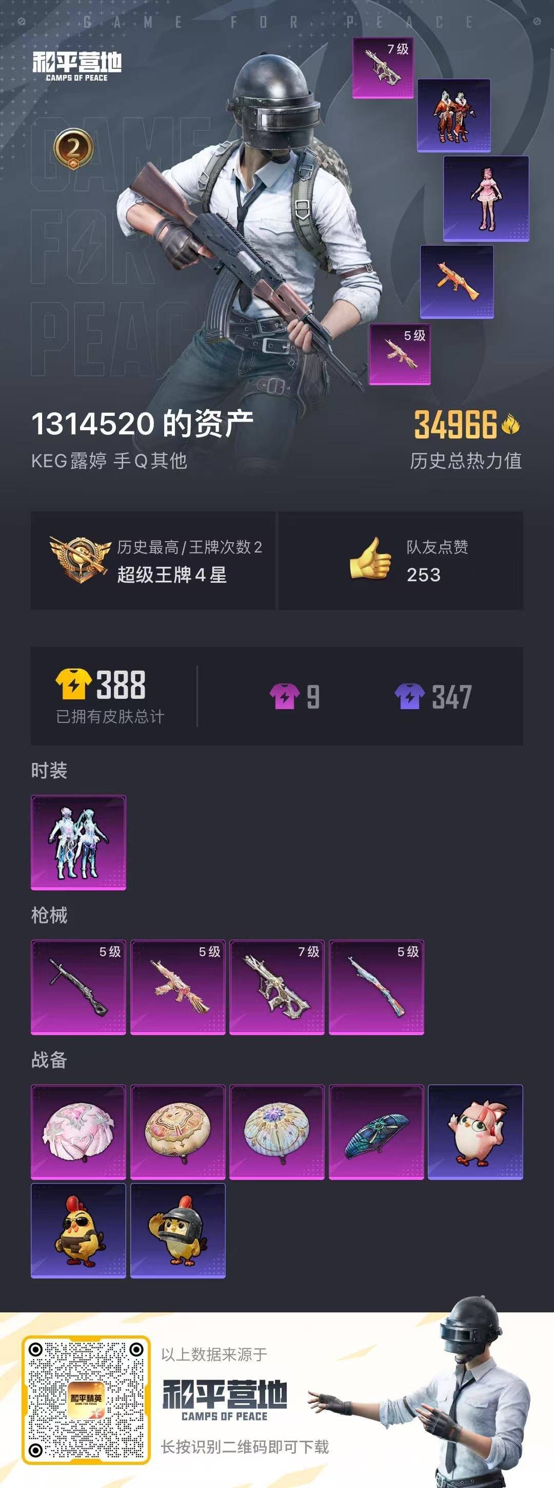 - PX_2091215- 苹果手Q-4王牌印记-1粉装-1特效枪-1载具-17231热力值-42套装-61枪皮-1卓越印记-0传奇印记 【1粉装】,时光之吻 【1特效枪】Mk14-甜梦熊击-5级 【1稀有紫装】,暗影哥特, 【1稀有载具】,宝马M4(圣保罗黄), 【42稀有时装】,SS33特训,极速光影,暗影哥特,顶瓜瓜,狂沙舞者,白糯汤圆,福星高照,夏日音浪,白色伏地魔,冰川格斗者,湖蓝色名流,