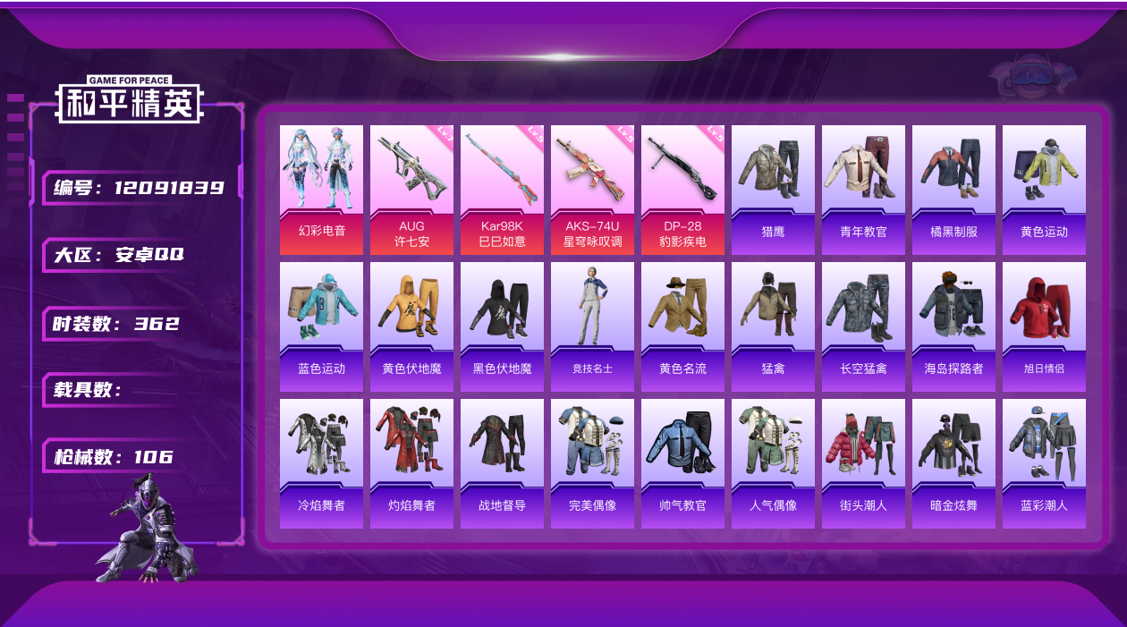 [12091839]1粉装 4特效枪 2印记 可二次 可修改实名 优质装备:AUG-许七安,七级AUG-许七安,AKS-74U-星穹咏叹调,幻彩电音,Kar98K-巳巳如意 稀有枪皮:DP-28-豹影疾电 五级特效枪:五级Kar98K-巳巳如意,五级DP-28-豹影疾电,五级AKS-74U-星穹咏叹调 紫色装扮:SS23特训,极速光影,SS30特训套装,SS31特训套装,云朵鹅,彩虹兔,雪绒豹,SS33特训套装,旭日情侣,顶瓜瓜,冷焰舞者,北国孤狼,夏日音浪,完美偶像,帅气教官,幻世战舞者,人气偶像,欧布奥特曼,瑞龙福将,团圆交子,SS17特训,SS14特训,SS15特训,SS20特训,SS18特训,SS19特训,黄色名流,青年教官,魅力单车,黄色伏地魔,黄色运动,黑色伏地魔,龙的传人,龟仙人,蝶变,香桃花海,都市魅力,野性战心,长空猛禽,蜜露汐语,街头潮人,灼焰舞者,炫蓝之夏,海岛探路者,战地督导,暗金炫舞,柠萌假日,橘黑制服,竞技达人朋克,绮丽涂鸦,缤纷果语,蓝彩潮人,蓝色运动,空投萌叽,猎鹰,猛禽,王牌教练,空岛之星,疯狂小兔子,破晓战魂,破蛋小黄鸡,福星高照,SS29特训,星途旅人,SS28特训,巳巳如意,智谋强哥,异域银装,竞技名士,街头风暴,粉红小猪,SS24特训(SS24特训套装),SS25特训,SS27特训,情公主,SS26特训,SS12特训,SS13特训,耀粉歌者,大橘大利,SS32特训服(SS32特训套装),萌黄之夏,恋语绒绒 优质战备:冷漠罗丽降落伞,智耀战神降落伞,暗夜玫瑰降落伞