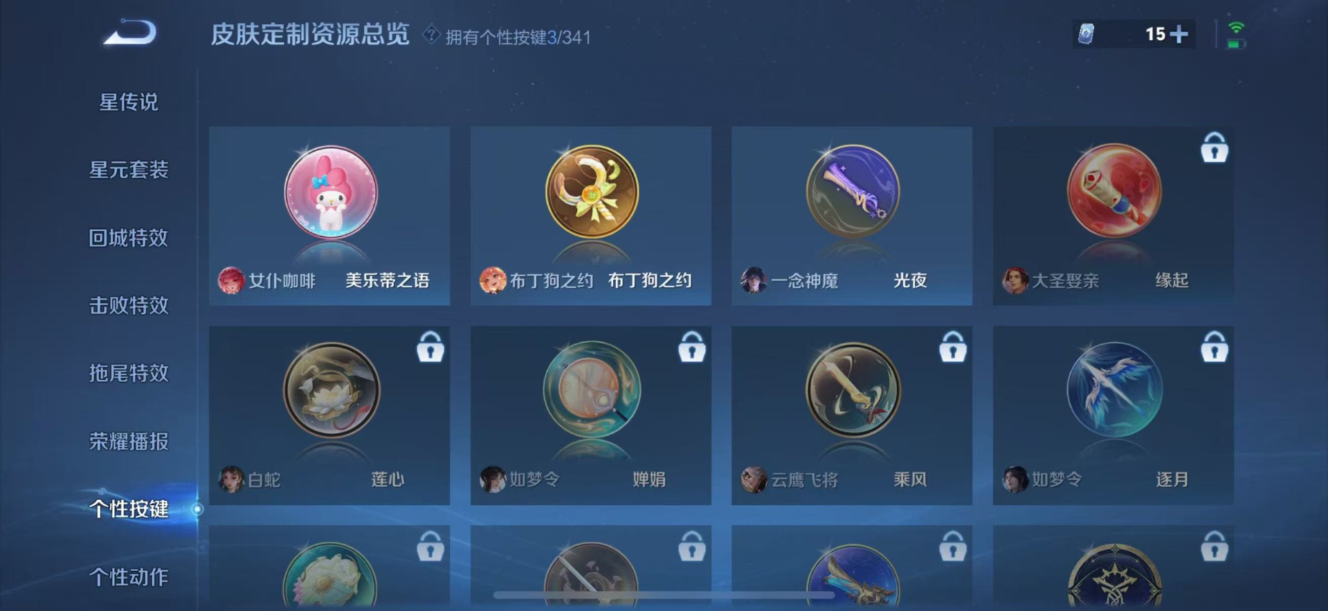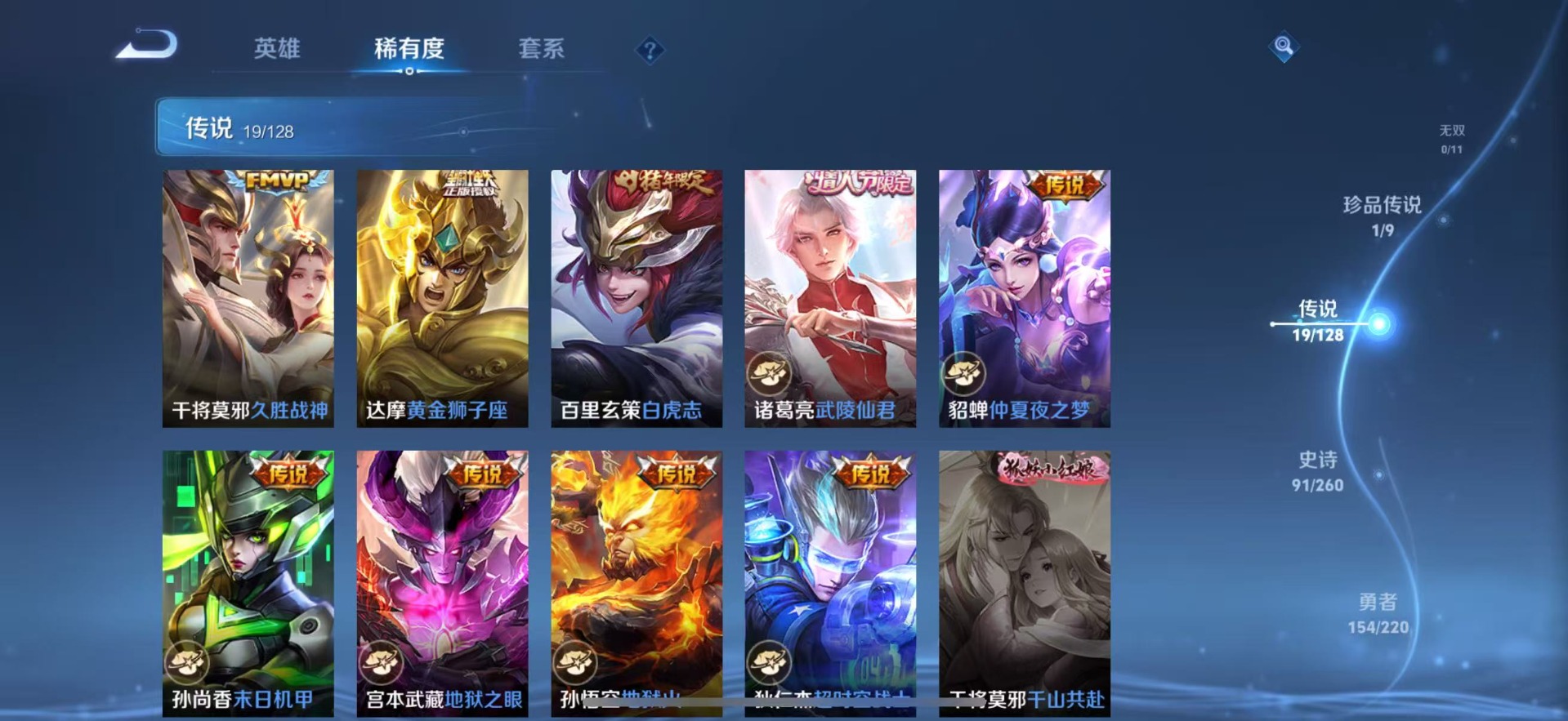 夏侯惇匿光决锋者,赵云百木心枪,赵云龙胆,公孙离玉兔公主,司空震愿照·山河定,裴擒虎李小龙,上官婉儿梁祝,花木兰青春决赛季,马可波罗山海·玄木吟,桑启鸣野蒿,孙悟空孙行者,百里玄策白虎志,妲己时之彼端,韩信傲雪梅枪,韩信飞衡,虞姬霸王别姬
