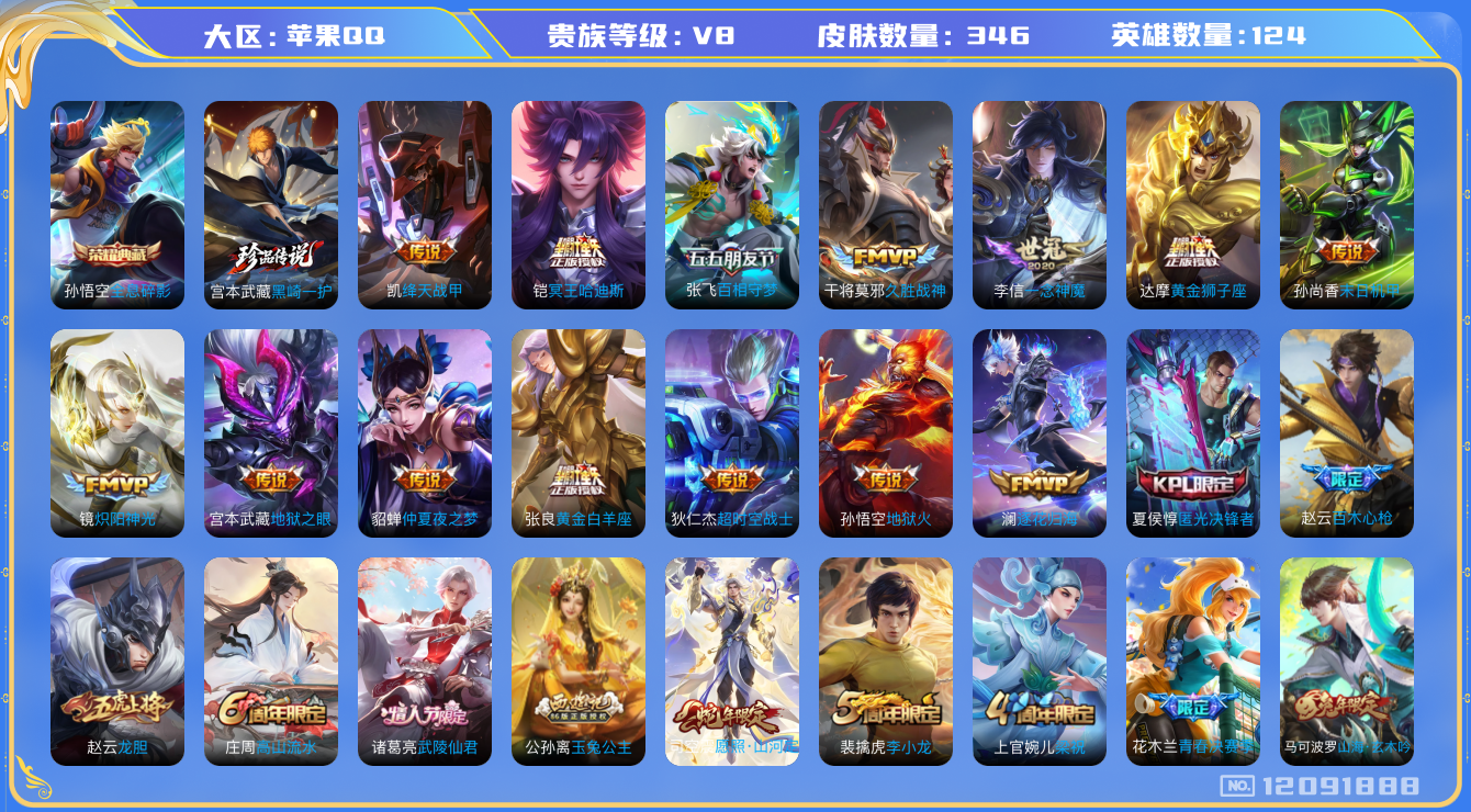 [12091888]V8 1典藏 1珍品传说 19传说 124英雄 346皮肤 可修改实名 优质装备:全息碎影(猴子典藏),黑崎一护,黄金狮子座,绛天战甲(鸡嘴战神),黄金白羊座,久胜战神,炽阳神光,一念神魔,末日机甲-孙尚香(绿蚂蚱),地狱火,仲夏夜之梦(大飞蛾),地狱之眼,超时空战士-狄仁杰,百相守梦(张飞),澜逐花归海 传说皮:铠冥王哈迪斯 珍宝阁皮:胡桃夹子,蔷薇恋人,玩趣恶龙 限定皮:愿照·山河定(司空震年限),鸣野蒿,白虎志(电光耗子),武陵仙君(小桃花),傲雪梅枪,时之彼端,飞衡(韩信年限),高山流水,匿光决锋者,五谷丰年,梁祝,龙胆,李小龙,霸王别姬-虞姬,孙行者,青春决赛季,百木心枪,玉兔公主,山海·玄木吟(马可年限) 史诗皮:灵蛊蚀心,星界战将,龙之律动,石田雨龙,茶境仙,怒海争锋,蒙犽顽岩魄,决胜骁骑,遇见神鹿,紫霞仙子,电玩小子(小书包),白龙吟,黄金分割率,特工魅影,千年之狐,江河有灵,魅语,百解令(蒙犽),高渐离燃音魔法,蒙恬荣光圣徽,无限星赏官,偶像歌手,龙骑士(小龙虾),末日机甲-吕布,猫狗日记-孙策,乱世虎臣,节奏热浪,修罗,女仆咖啡,摇滚巨星,水果甜心,绅士熊喵,天才门将,星夜王子,功夫厨神,德古拉伯爵,暗隐猎兽者,幽灵船长,鬼剑武藏,心灵战警,天秀·启明,舞动绿茵,地狱岩魂,纤云弄巧,拒霜思,缤纷独角兽,乘风破浪,逐浪之夏,水晶猎龙者,曙光守护者,箭羽风息,金属风暴,原初追逐者,圣诞狂欢,圣诞恋歌,鹰眼统帅,暗夜贵公子,魅力维加斯,黎明之约,赏金猎手,奇遇舞章,无心,未来纪元-赵云