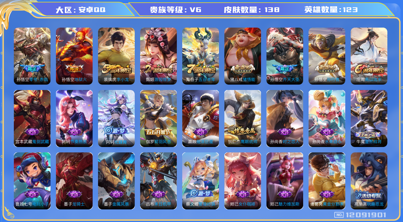 [12091901]V6 3传说 123英雄 138皮肤 可修改实名 优质装备:地狱火,零号·赤焰 珍宝阁皮:蔷薇恋人,玩趣恶龙 限定皮:高山流水,齐天大圣,五谷丰年,游园惊梦,李小龙,孙行者,猪悟能 史诗皮:化蝶舞,星界战将,电玩小子(小书包),黄金分割率,龙骑士(小龙虾),末日机甲-吕布,时之恋人-孙尚香,节奏热浪,女仆咖啡,摇滚巨星,水果甜心,鬼剑武藏,繁星吟游(呼啦呼啦),箭羽风息,金属风暴,鹰眼统帅,魅力维加斯