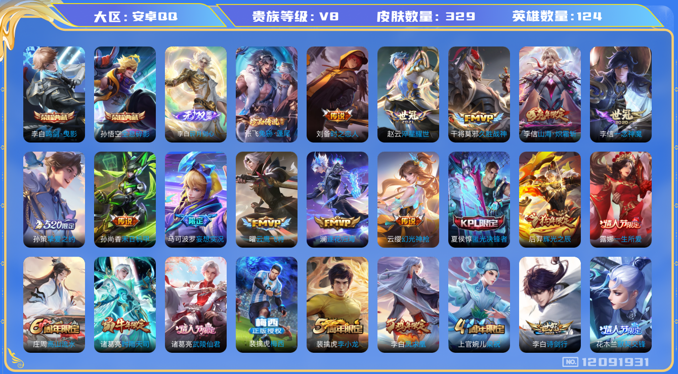 [12091931]V8 2典藏 1无双 1珍品传说 18传说 124英雄 329皮肤 可修改实名 优质装备:鸣剑·曳影,全息碎影(猴子典藏),碎月剑心(李白无双),云鹰飞将(小将军),久胜战神,一念神魔,末日机甲-孙尚香(绿蚂蚱),时之恋人-刘备(电焊工),淬星耀世,挚爱之约,山海·炽霜斩(李信年限),妄想实况,澜逐花归海 珍品传说:兔狲·蓬尾 传说皮:幻光神枪 珍宝阁皮:万物之道,优雅恋人,蔷薇恋人,玩趣恶龙 限定皮:鸣野蒿,至尊宝,凤求凰(白切鸡),梅西,武陵仙君(小桃花),傲雪梅枪,时雨天司(水龙头),神威(电光马子),飞衡(韩信年限),高山流水,诗剑行,匿光决锋者,五谷丰年,梁祝,李小龙,辉光之辰,默契交锋-花木兰,孙行者,一生所爱,大圣娶亲,青春决赛季,枫霜尽,山海·玄木吟(马可年限) 史诗皮:鸭鸭历险记-刘禅,器灵·浮梦炉,星界战将,龙之律动,石田雨龙,茶境仙,破空之剑,决胜骁骑,织梦人,紫霞仙子,苍穹之光,电玩小子(小书包),白龙吟,黄金分割率,特工魅影,千年之狐,永昼,江河有灵,魅语,蒙恬荣光圣徽,无限星赏官,冰冠公主,偶像歌手,暗夜猫娘,末日机甲-吕布,猫狗日记-孙策,猫狗日记-大乔,乱世虎臣,节奏热浪,修罗,女仆咖啡,摇滚巨星,水果甜心,天才门将,星夜王子,心灵骇客,功夫厨神,德古拉伯爵,暗隐猎兽者,幽灵船长,鬼剑武藏,心灵战警,乐园奇幻夜,舞动绿茵,地狱岩魂,纤云弄巧,缤纷独角兽,乘风破浪,逐浪之夏,月团寄思,水晶猎龙者,金属风暴,原初追逐者,圣诞狂欢,圣诞恋歌,鹰眼统帅,暗夜贵公子,魅力维加斯,黎明之约,无心,未来纪元-赵云