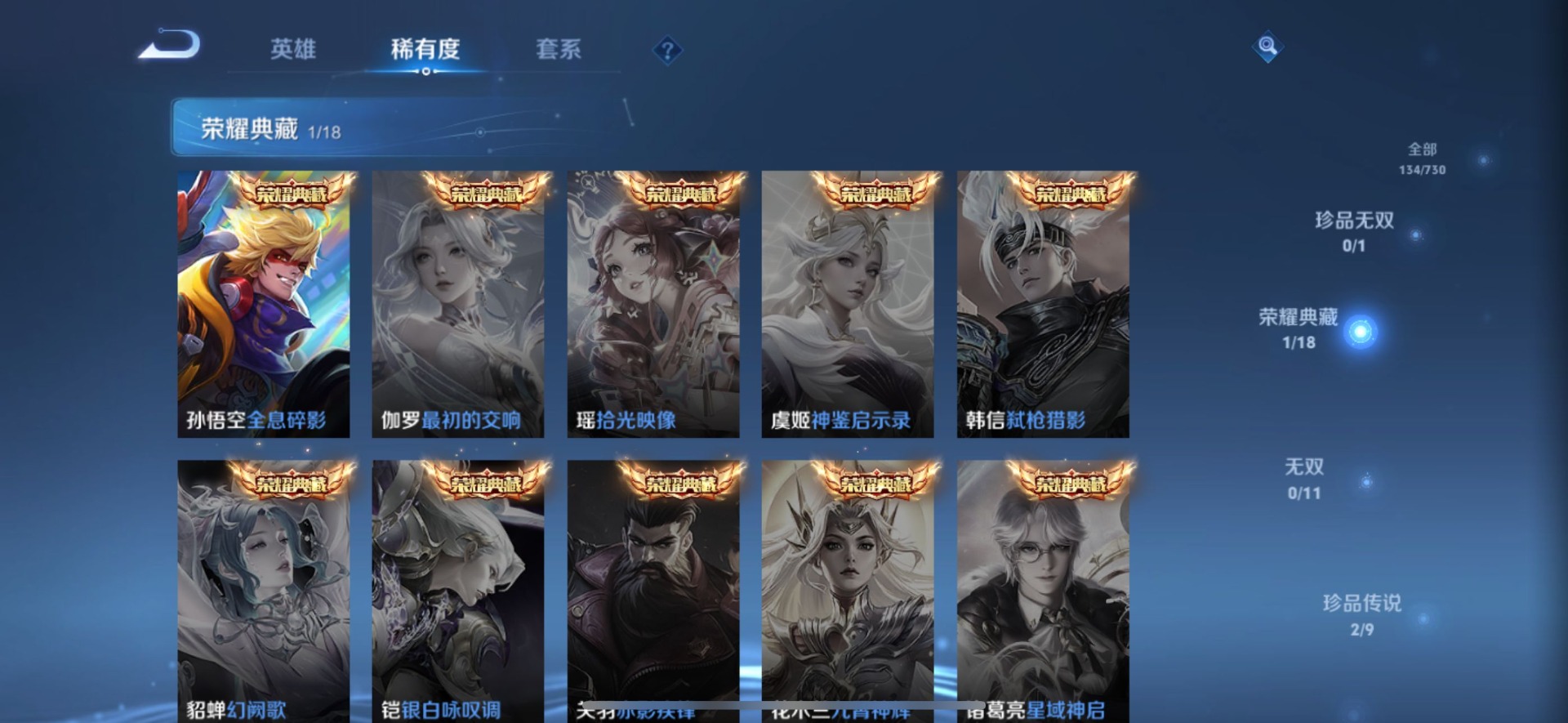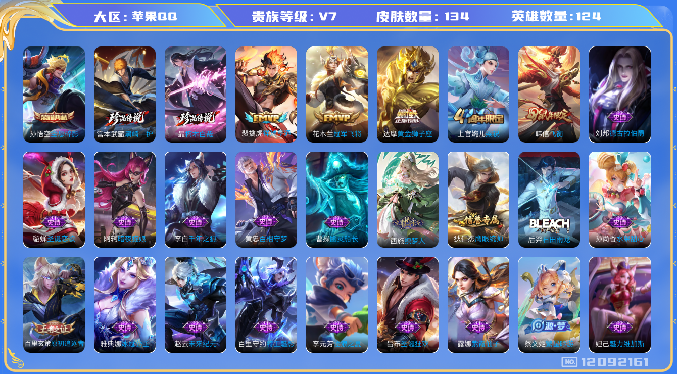[12092161]V7 1典藏 2珍品传说 3传说 124英雄 134皮肤 可修改实名 优质装备:全息碎影(猴子典藏),朽木白哉,黑崎一护,黄金狮子座,冠军飞将 传说皮:祥瑞亨通 限定皮:飞衡(韩信年限),梁祝 史诗皮:龙之律动,石田雨龙,百相守梦-黄忠,织梦人,紫霞仙子,特工魅影,千年之狐,冰冠公主,偶像歌手,暗夜猫娘,水果甜心,德古拉伯爵,幽灵船长,繁星吟游(呼啦呼啦),逐浪之夏,原初追逐者,圣诞狂欢,圣诞恋歌,鹰眼统帅,魅力维加斯,未来纪元-赵云