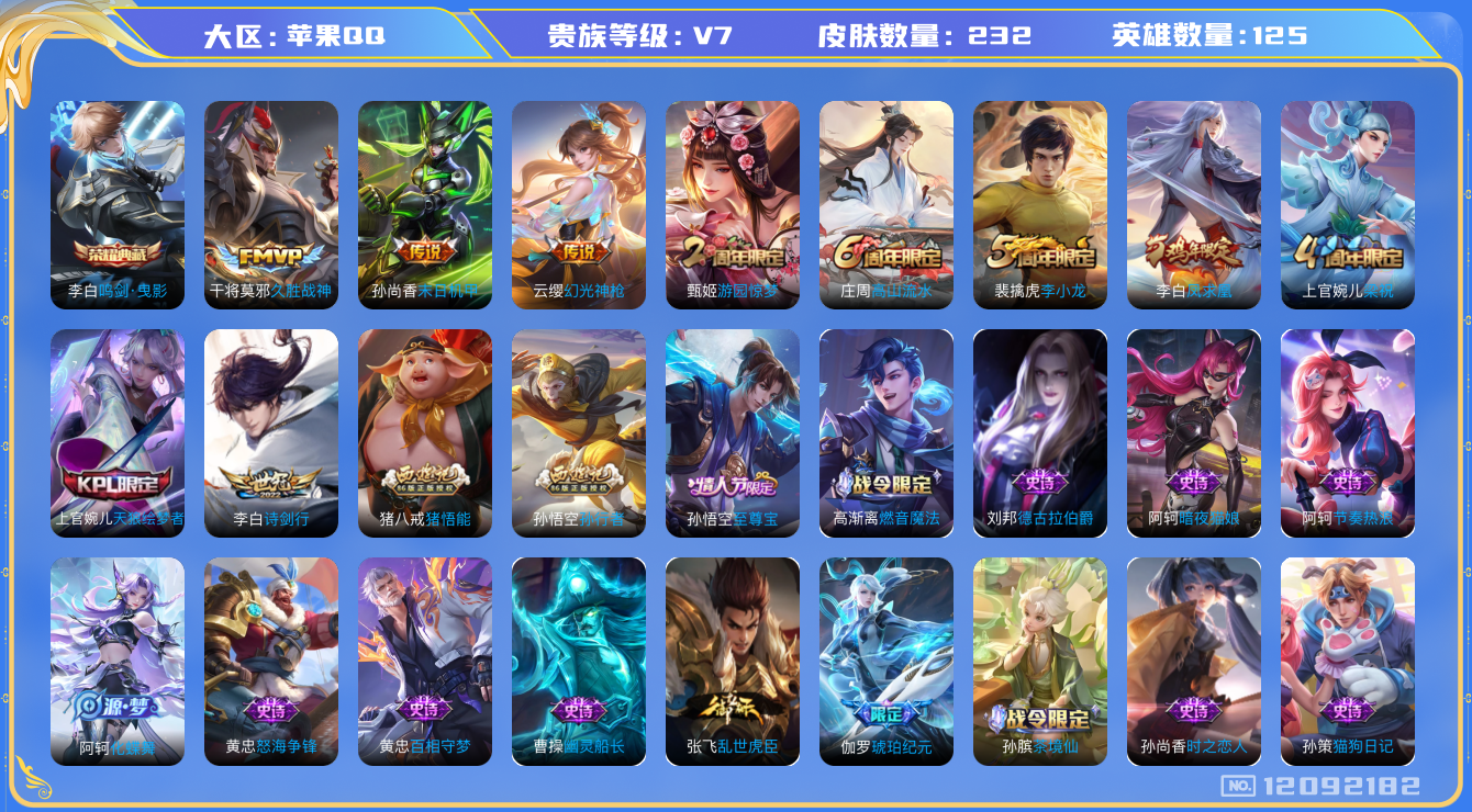 [12092182]V7 1典藏 5传说 125英雄 232皮肤 可修改实名 优质装备:鸣剑·曳影,久胜战神,末日机甲-孙尚香(绿蚂蚱),涂山容容 传说皮:幻光神枪 珍宝阁皮:胡桃夹子,优雅恋人 限定皮:至尊宝,凤求凰(白切鸡),高山流水,诗剑行,游园惊梦,梁祝,天狼绘梦者,李小龙,孙行者,猪悟能 史诗皮:化蝶舞,茶境仙,怒海争锋,东方月初,琥珀纪元伽罗,决胜骁骑,蔬乡物语(鲁班七号),百相守梦-黄忠,紫霞仙子,电玩小子(小书包),黄金分割率,特工魅影,千年之狐,江河有灵,高渐离燃音魔法,冰冠公主,偶像歌手,暗夜猫娘,猫狗日记-孙策,时之恋人-孙尚香,乱世虎臣,节奏热浪,修罗,女仆咖啡,水果甜心,绅士熊喵,星夜王子,时之奇旅-安琪拉,德古拉伯爵,暗隐猎兽者,幽灵船长,鬼剑武藏,舞动绿茵,纤云弄巧,拒霜思,逐浪之夏,金属风暴,原初追逐者,圣诞狂欢,圣诞恋歌,鹰眼统帅,魅力维加斯,黎明之约