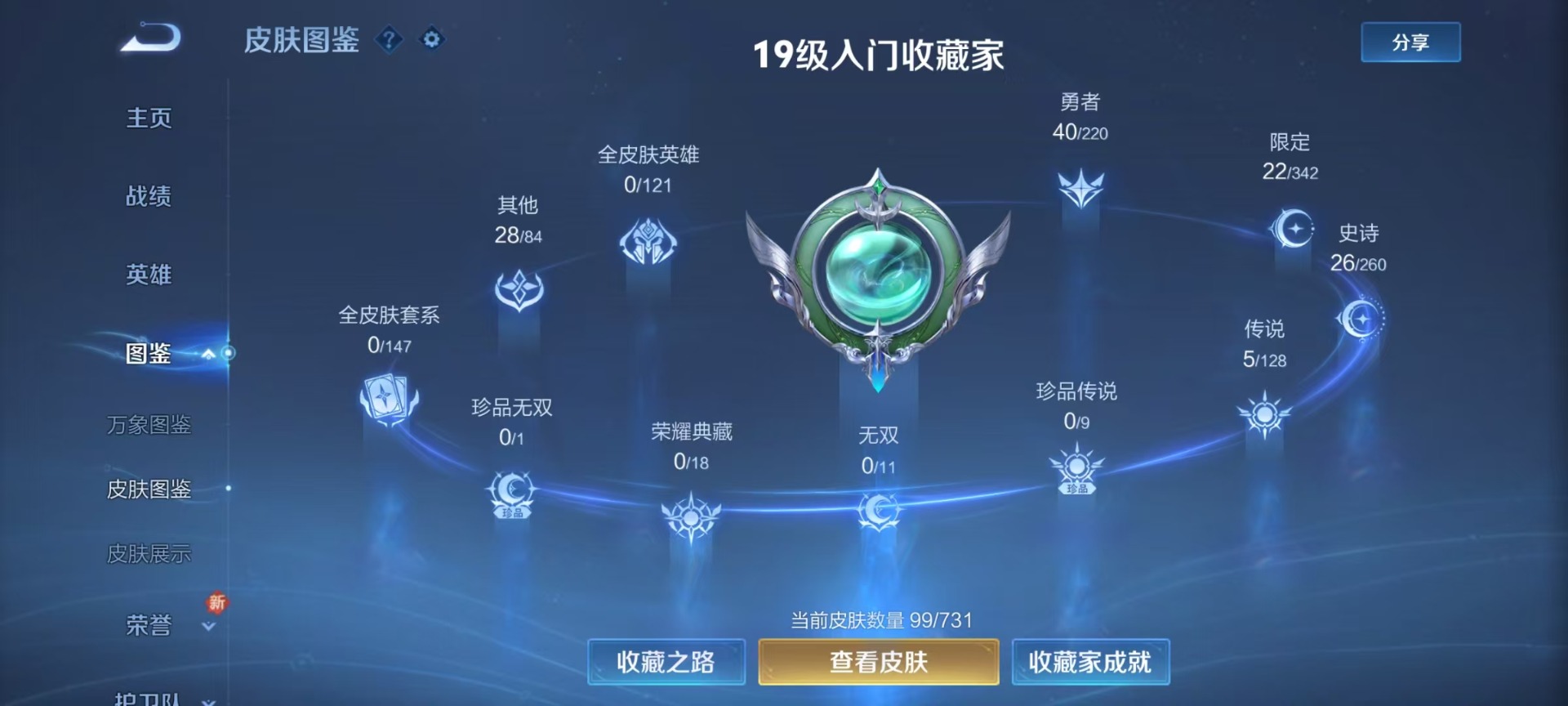 - PX_2084338-贵族等级: V4 英雄数: 27 皮肤数: 21 珍品传说: 兔狲·蓬尾 限定皮: 神器·万象笔