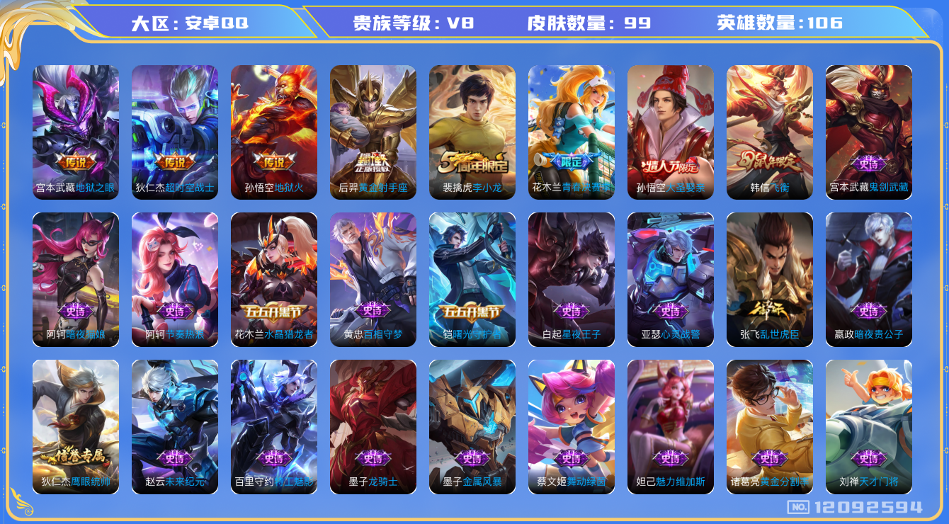 [12092594]V8 5传说 106英雄 99皮肤 可修改实名 优质装备:黄金射手座,地狱火,地狱之眼,超时空战士-狄仁杰 限定皮:飞衡(韩信年限),李小龙,大圣娶亲,青春决赛季 史诗皮:百相守梦-黄忠,黄金分割率,特工魅影,暗夜猫娘,龙骑士(小龙虾),乱世虎臣,节奏热浪,绅士熊喵,天才门将,星夜王子,鬼剑武藏,心灵战警,舞动绿茵,水晶猎龙者,曙光守护者,金属风暴,鹰眼统帅,暗夜贵公子,魅力维加斯,未来纪元-赵云
