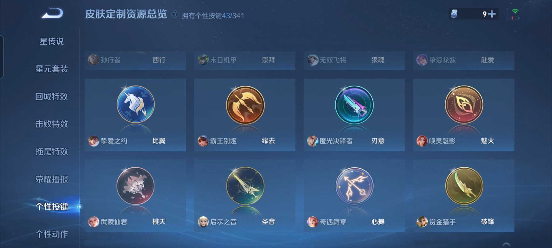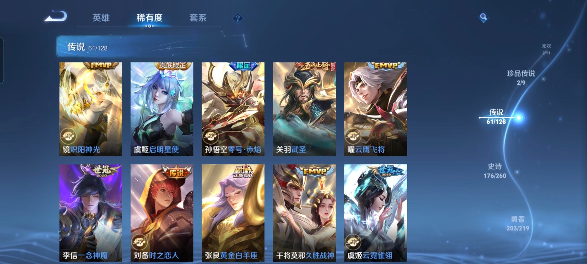 夏侯惇匿光决锋者,曹操天狼征服者,露娜启示之音,露娜一生所爱,庄周云端筑梦师,司空震愿照·山河定,裴擒虎李小龙,裴擒虎天狼狩猎者,上官婉儿梁祝,花木兰默契交锋,马可波罗山海·玄木吟,孙悟空孙行者,孙悟空大圣娶亲,孙悟空至尊宝,孙悟空美猴王,云中君时之祈愿,韩信傲雪梅枪,韩信逐梦之影,百里守约朱雀志,澜愿照·九州拓,虞姬霸王别姬,虞姬愿照·岁时盈,哪吒逐梦之翼,铠青龙志,赵云百木心枪,赵云龙胆,典韦岱宗,吕布御风骁将,后羿如梦令,后羿辉光之辰,公孙离玉兔公主,兰陵王影龙天霄,公孙离蜜橘之夏,李白诗剑行,桑启鸣野蒿,女娲补天,女娲愿照·千秋盛,马超神威,赵云引擎之心,盘古冰霜神祇,妲己愿照·众生和,蔡文姬愿照·福禄聚,关羽武圣
