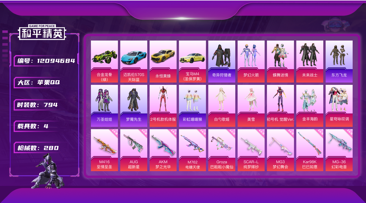 [12094684]HP0036 苹果Q 9粉装10特效枪4载具 203套装280枪皮 历史无敌战神 奇异狩猎者 AKM-百万伏特 浪漫天命 宝马M4(圣保罗黄) 迈凯伦570S天际蓝 合金龙骨绿色 永恒黄蜂 觉醒初号机 红螳螂 梦幻火箭 蝶舞迷情 美雪 金丰海韵 星穹咏叹调 白勺歌姬 未来战士 SCAR-L-纯梦嫁纱 (5级) Kar98K-巳巳如意 (5级) MG-36-幻彩电音 (5级) M762-电糖天使 (5级) DP-28-豹影疾电 (5级) AUG-超新星 (6级) GROZA-巴啦啦小魔仙 (5级) M416-至情至圣 (9级) MG3-梦幻舞会 (5级) AKM-梦之光华 (5级) 8号机 Mark.06 龟仙人 浪漫假日 雪山精英 东方飞龙 梦魇先生 万圣娃娃 忍者信条 狂沙舞者 黑色刀锋 军刀雅典娜 M416-仓鼠灰灰 M762-奇异狩猎者 M762-潮萌小黄鸭 M24-奇异狩猎者 S686-奇异狩猎者 AUG-魔法学院 梦幻火箭飞行器 鎏金朋克飞行器 黄族统领飞行器 青春物语飞行器 梦幻火箭头盔 火曜朱雀头盔 百万伏特头盔 幻影战神头盔 精灵迷巫背包 梦幻火箭背包 火曜朱雀背包 百万伏特背包 幻影战神背包 金羽特工背包