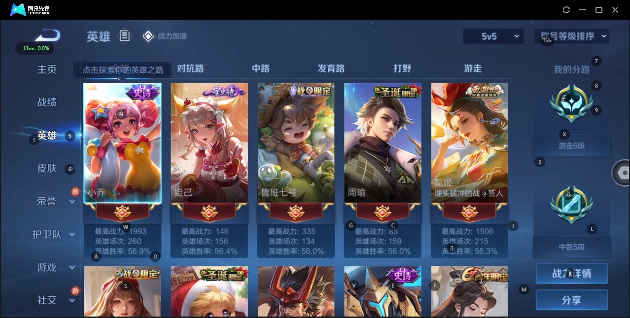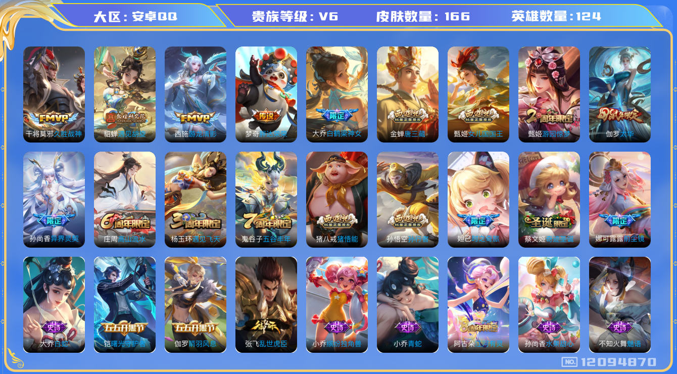 [12094870]V6 7传说 124英雄 166皮肤 可修改实名 传说皮:遇见胡旋,游龙清影(小青龙),久胜战神,胖达荣荣 珍宝阁皮:女武神 限定皮:太华(伽罗年限),异界灵契(白毛香),前尘镜,白鹤梁神女,遇见飞天,高山流水,五谷丰年,游园惊梦,奇迹圣诞,孙行者,猪悟能,女儿国国王,唐三藏,时之奇旅-妲己 史诗皮:蔬乡物语(鲁班七号),遇见神鹿,电玩小子(小书包),冰冠公主,白蛇,魅语,青蛇,百解令(蒙犽),雪夜绮愿(周瑜),江河有灵,乱世虎臣,女仆咖啡,水果甜心,星夜王子,心灵骇客,时之奇旅-安琪拉,功夫厨神,繁星吟游(呼啦呼啦),拒霜思,缤纷独角兽,曙光守护者,箭羽风息,金属风暴,圣诞恋歌,鹰眼统帅,魅力维加斯,滕王阁序