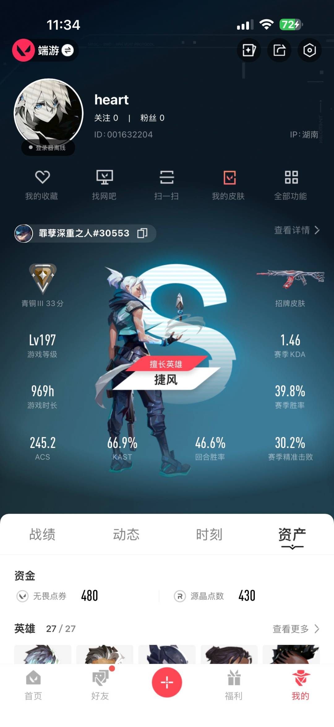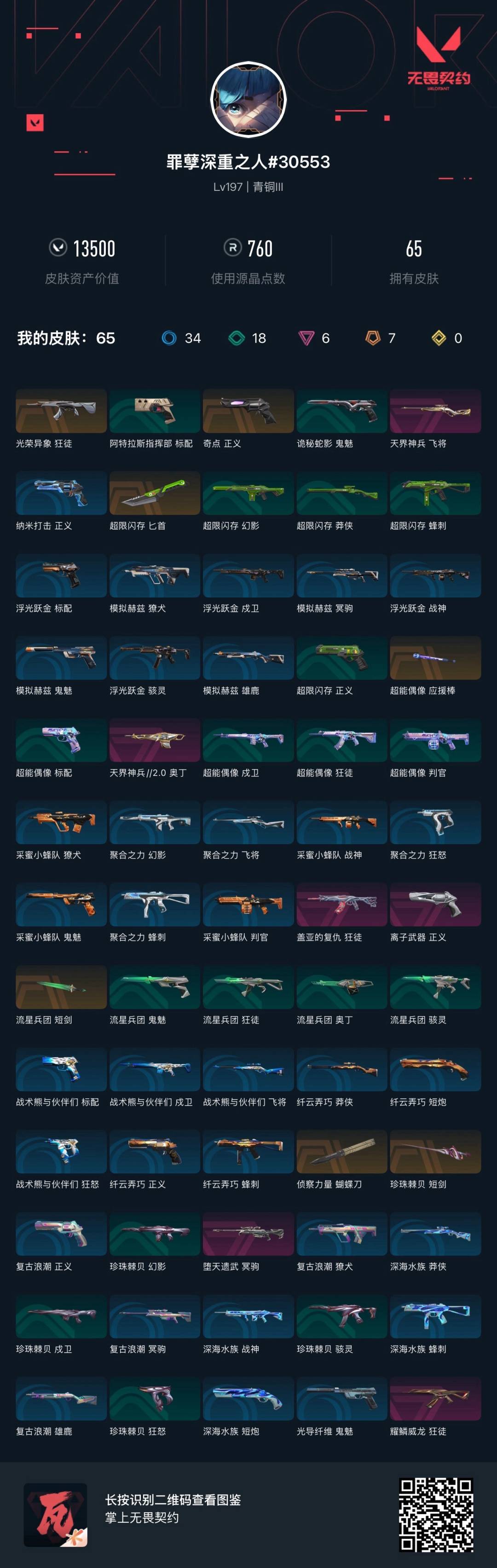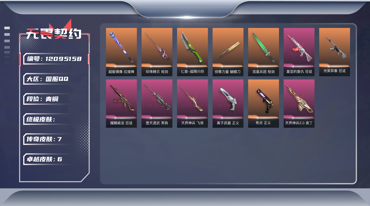 [12095158]7橙皮 6紫皮 65皮肤 27英雄 122卡面 760已用源晶 青铜 优质装备:正义-奇点,狂徒-盖亚的复仇,冥驹-堕天遗武,正义-离子武器,蝴蝶刀-侦察力量,飞将-天界神兵,狂徒-耀鳞威龙,奥丁-天界神兵2.0,匕首-超限闪存 步枪皮肤:狂徒-光荣异象 近战武器皮肤:短剑-流星兵团,短剑-珍珠棘贝,超能偶像 应援棒