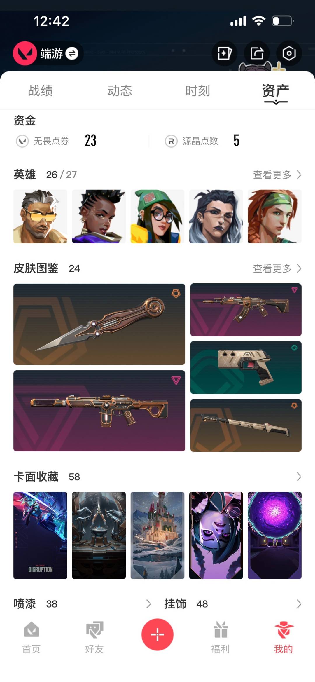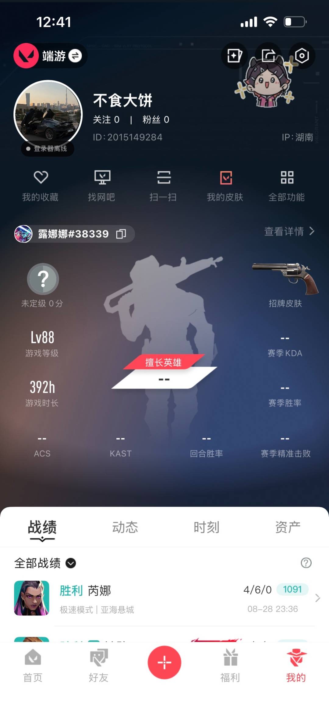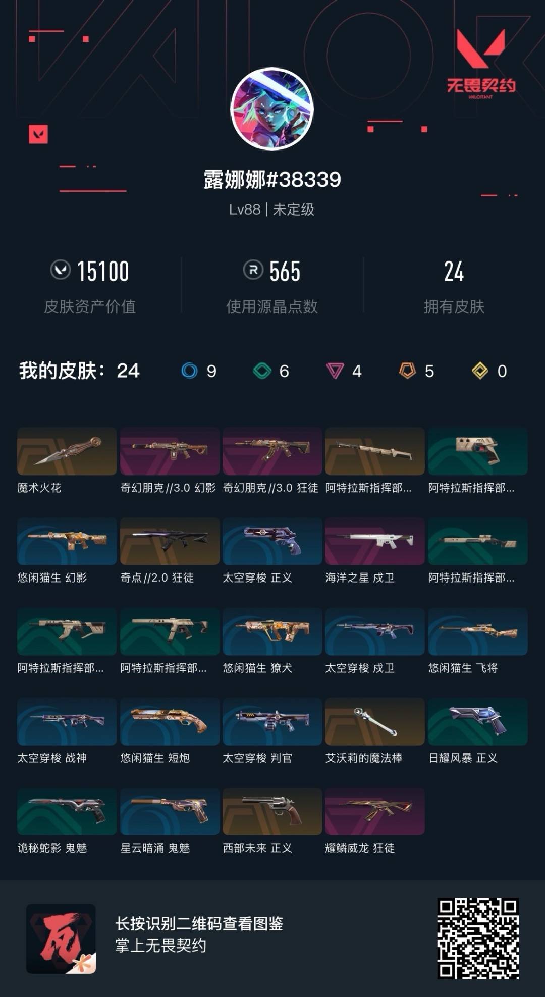 [11929671]5橙皮 4紫皮 24皮肤 26英雄 58卡面 565已用源晶 未定级 优质装备:狂徒-奇点//2.0,狂徒-耀鳞威龙,艾沃莉的魔法棒,阿特拉斯指挥部,魔术火花,戍卫-海洋之星 佩枪皮肤:正义-西部未来 步枪皮肤:奇幻朋克3.0狂徒,幻影-奇幻朋克3.0