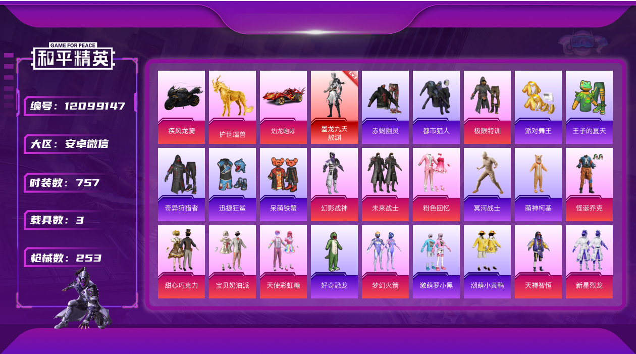 [12099147]1红装 20粉装 16特效枪 3载具 9印记 可二次 可修改实名 安全保护中 身法装备:赤蝎幽灵,都市猎人,舞王派对(派对舞王、小金鞋),暗影哥特(红眼罩),冥河战士(老木乃伊),零号机款机体服(黄螳螂),初号机 觉醒Ver.(新紫螳螂),Mark.06(新蓝螳螂) 优质装备:一级墨龙九天-敖渊(1级敖渊1级野人),墨龙九天-敖渊(野人),冥河战士(老木乃伊),木乃伊套装(老)(冥河战士),怪诞乔克(小丑),护世瑞兽,零号机款机体服(黄螳螂),甜心巧克力,焰龙咆哮,舞王派对(派对舞王、小金鞋),赤蝎幽灵,都市猎人,枪皮-星际漫游M416,M416五爪金龙,奇异狩猎者,梦幻火箭(新101)(新火箭少女101粉色套装),极限特训,幻影战神,未来战士,宝贝奶油派,天使彩虹糖,粉色回忆,SCAR-L童趣迷兔,天禅智恒,绚金战神,炙焰红王,冰霜白皇,新星烈龙(小白龙),童趣迷兔,星之彼岸,AUG星之彼岸,UMP45相思残雪(UMP45-相思残雪),M416风花雪月,AKM星际浪客,M416墨龙九天,六级M416-墨龙九天,AUG星梦奇缘,GROZA-镜光银凌,SCAR-L金蛇镇世,星穹咏叹调,烟雾弹-电雾迷城,蜜獾-荧海星豚,Kar98K-巳巳如意 热门装扮:吟月归客,初号机 觉醒Ver.(新紫螳螂),暗夜行者,兔兔白日梦,萌神柯基,激萌罗小黑,潮萌小黄鸭,迅捷狂鲨,王子的夏天,呆萌铁蟹,都市猎人,好奇恐龙,派对舞王(小金鞋),赤蝎幽灵 载具:疾风龙骑 稀有枪皮:MG-36-沧焰双生,SCAR-L-魔童闹海 哪吒,DP-28-豹影疾电 五级特效枪:五级GROZA-镜光银凌,五级Kar98K-巳巳如意,五级烟雾弹-电雾迷城,五级DP-28-豹影疾电,五级MG-36-沧焰双生,五级UMP45-相思残雪 四级特效枪:四级AKM-星际浪客 三级特效枪:三级AUG-星梦奇缘,三级SCAR-L金蛇镇世,三级SCAR-L-魔童闹海 哪吒,三级M416-风花雪月 二级特效枪:二级蜜獾-荧海星豚 一级特效枪:一级M416-五爪金龙,一级SCAR-L-童趣迷兔,一级AUG-星之彼岸 紫色装扮:霓虹热舞,SS31特训套装,SS30特训套装,SS23特训,云朵鹅,彩虹兔,雪绒豹,SS33特训套装,旭日情侣,顶瓜瓜,幻彩翩翩,照水倚天,田园牧歌,轻风白浪,和煦暖阳,SS22特训,妙红点点,
