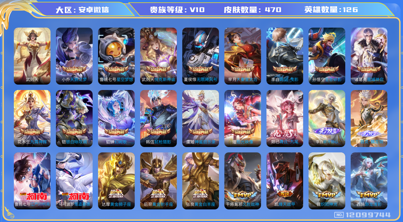 [12099744]【商品标题】:安卓WX-V10-至尊星耀II段位-126英雄-465皮肤-14典藏-0珍品无双-3无双-2珍品传说-82传说-142史诗