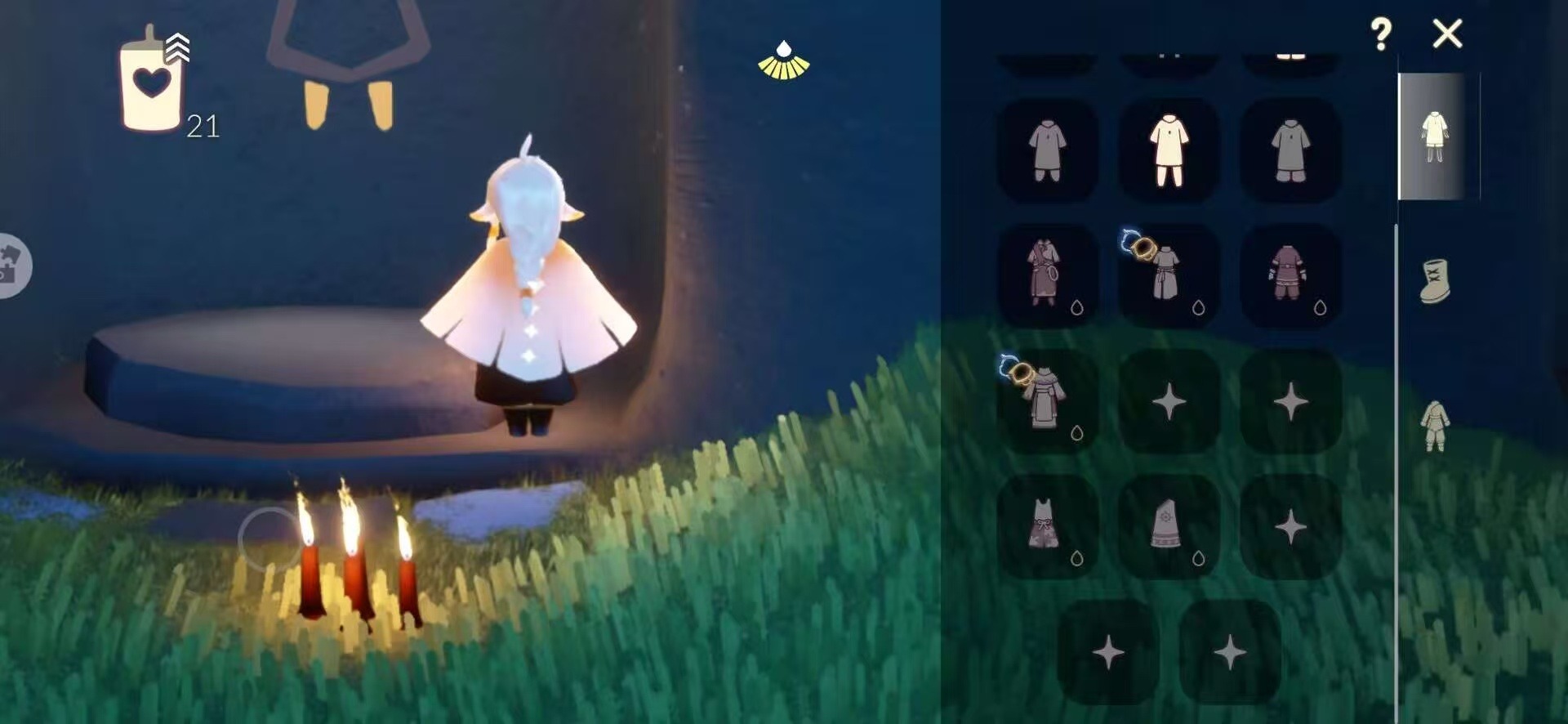 - [11241730]【毕业图】晨岛,雨林,霞谷 【毕业季】表演季,破晓季,欧若拉 【蜡烛】11 【爱心】18 【稀有礼包】音韵吉他,彩虹帽,巫师帽,贝壳发饰,蓝色音乐符,兔子发饰,大橘大利,蛛丝斗篷,雏鸟之琴 【毕业物品】白枭,黄眉企鹅面具,燕尾斗篷,双翼遥鲲斗,冥龙斗篷,留辫蘑菇头,高领舞服,透明蝶翼斗 【热门复刻】武士裤,正太头,虚荣,花环长发,红耳机,军帽,黑金斗篷,红金斗篷