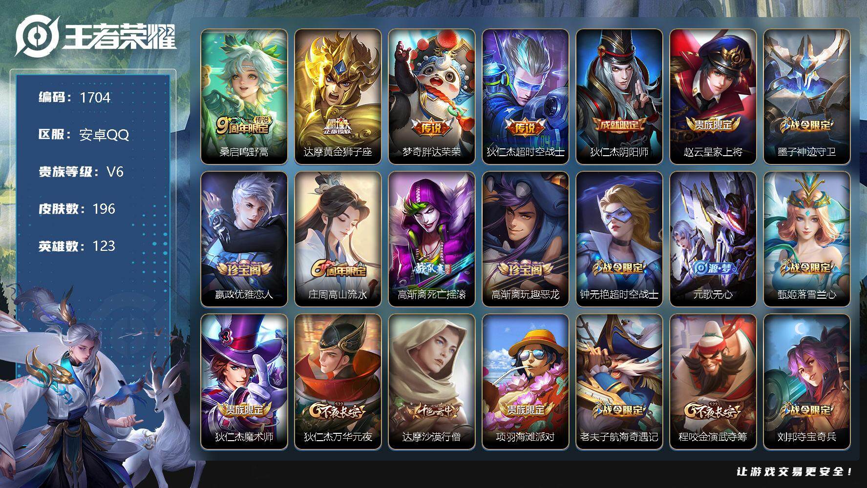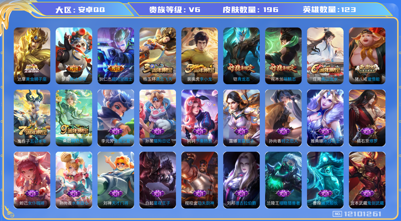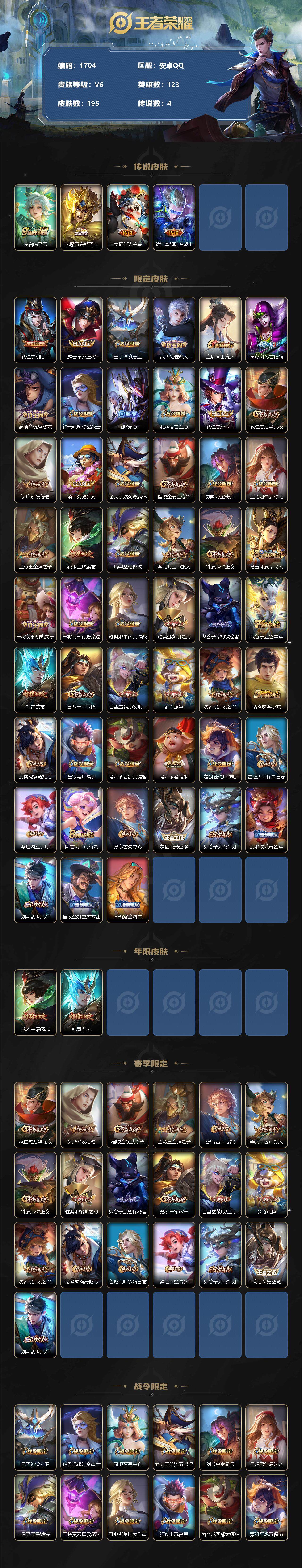 [12101261]【商品标题】:安卓Q-V6-永恒钻石I段位-123英雄-196皮肤-0典藏-0珍品无双-0无双-0珍品传说-4传说-53史诗