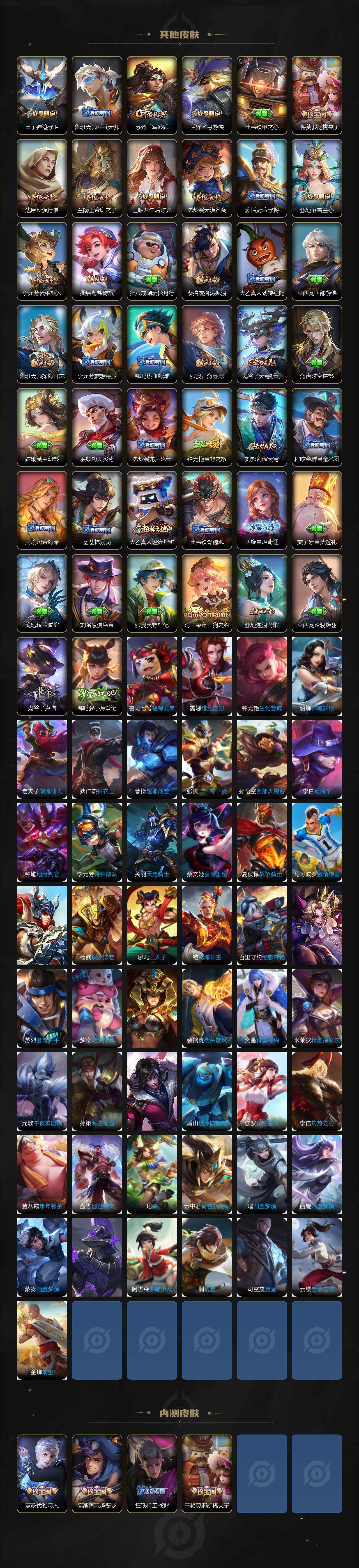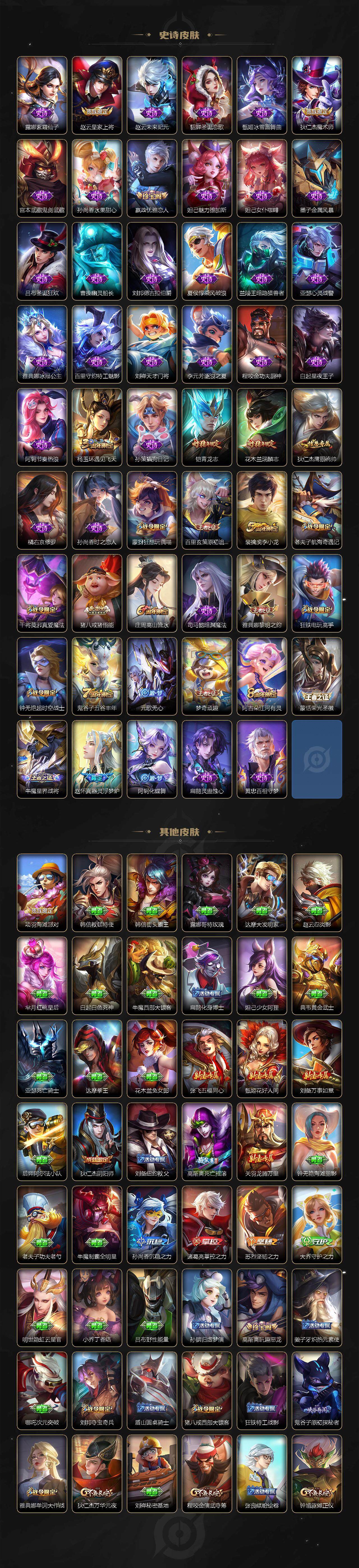 【限定皮肤】:狄仁杰阴阳师,赵云皇家上将,墨子神迹守卫,嬴政优雅恋人,庄周高山流水,高渐离死亡摇滚,高渐离玩趣恶龙,钟无艳超时空战士,元歌无心,甄姬落雪兰心,狄仁杰魔术师,狄仁杰万华元夜,达摩沙漠行僧,项羽海滩派对,老夫子航海奇遇记,程咬金演武夺筹,刘邦夺宝奇兵,王昭君午后时光,兰陵王金庭之子,花木兰瑞麟志,后羿圣弓游侠,李元芳云中旅人,钟馗驱傩正仪,杨玉环遇见飞天,干将莫邪胡桃夹子,干将莫邪真爱魔法,雅典娜单词大作战,雅典娜黎明之约,鬼谷子原初探秘者,鬼谷子五谷丰年,铠青龙志,苏烈千军破阵,百里玄策原初追逐者,梦奇顽趣,沈梦溪大漠名商,裴擒虎李小龙,裴擒虎擒涛扼浪,狂铁电玩高手,猪八戒西部大镖客,猪八戒猪悟能,蒙犽狂想玩偶喵,鲁班大师探海日志,桑启海盐诗旅,阿古朵江河有灵,张良古海寻踪,蒙恬荣光圣徽,鬼谷子天穹祈灯,沈梦溪龙舞盛年,刘邦剑破天穹,程咬金群星魔术团,周瑜熔金海岸