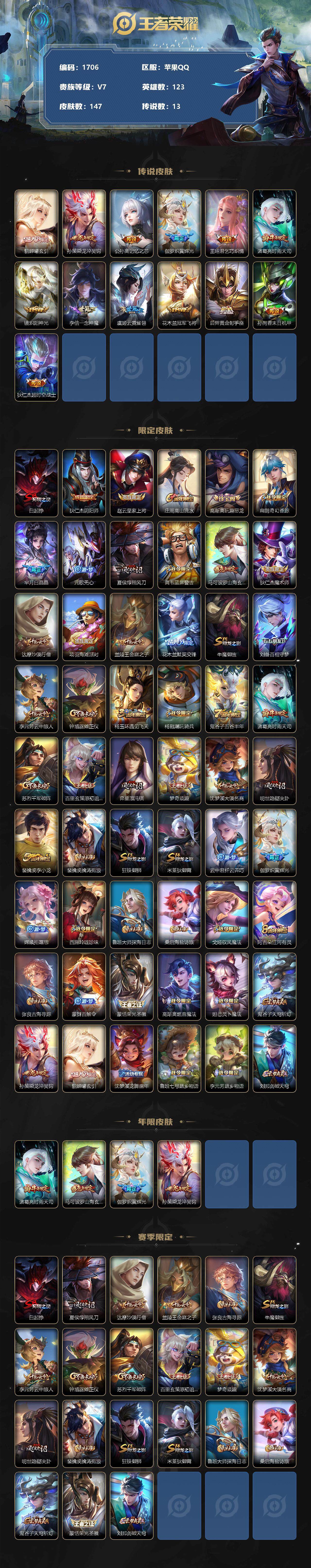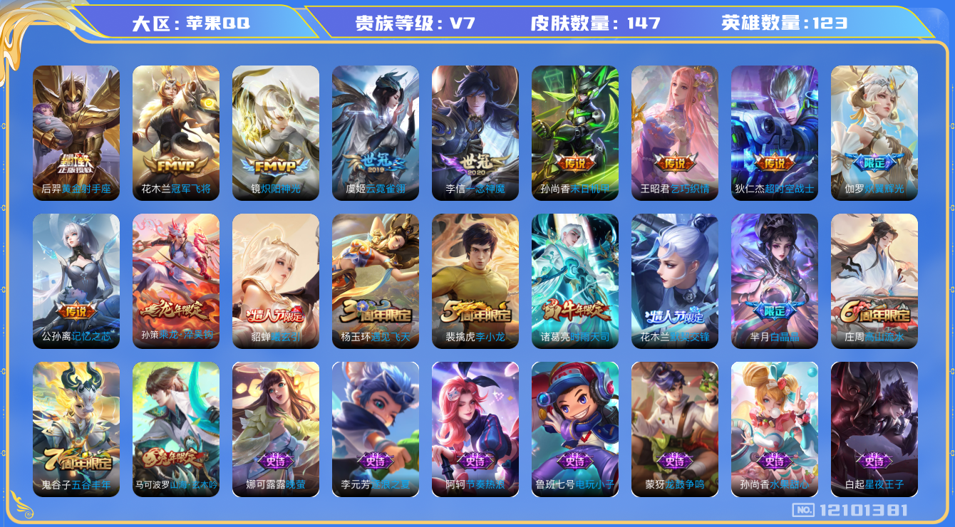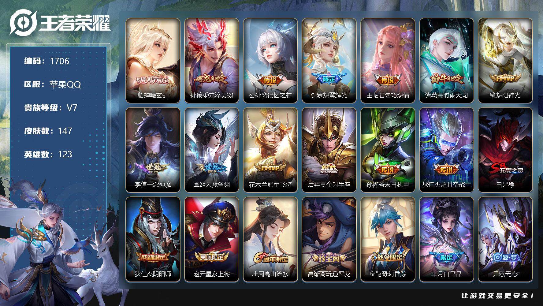 [12101381]【商品标题】:苹果Q-V0-尊贵铂金II段位-123英雄-147皮肤-0典藏-0珍品无双-0无双-0珍品传说-13传说-43史诗