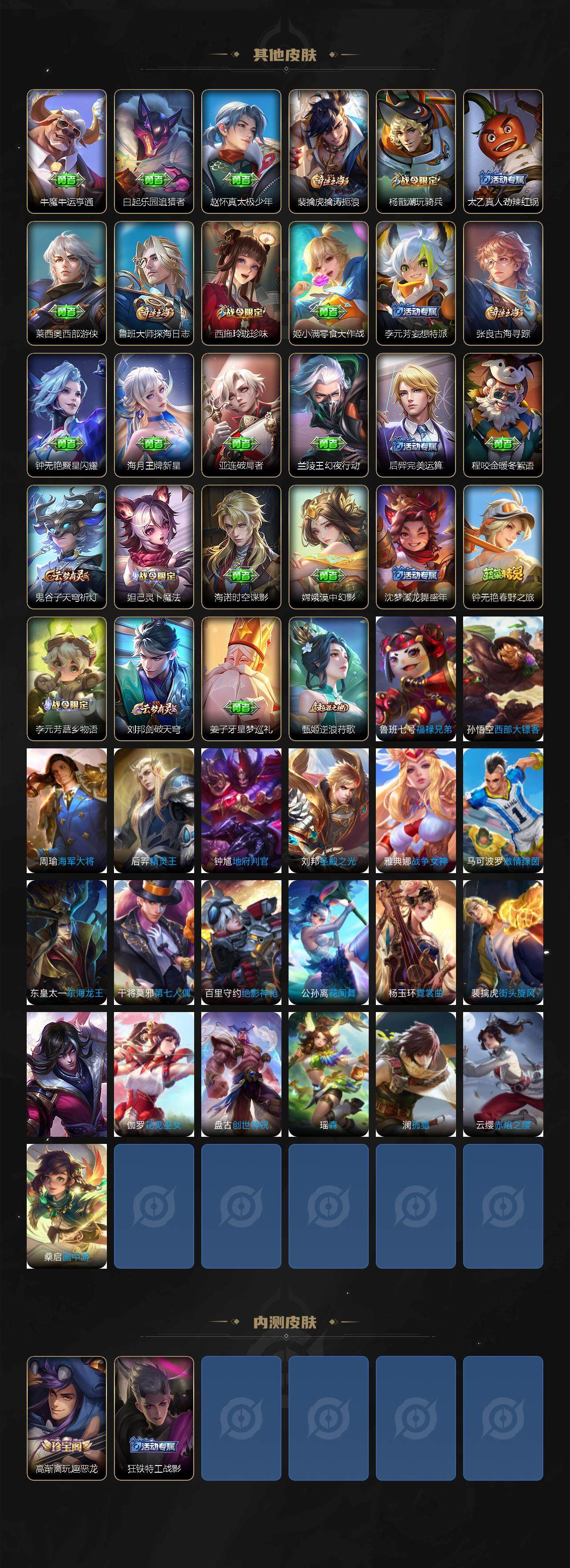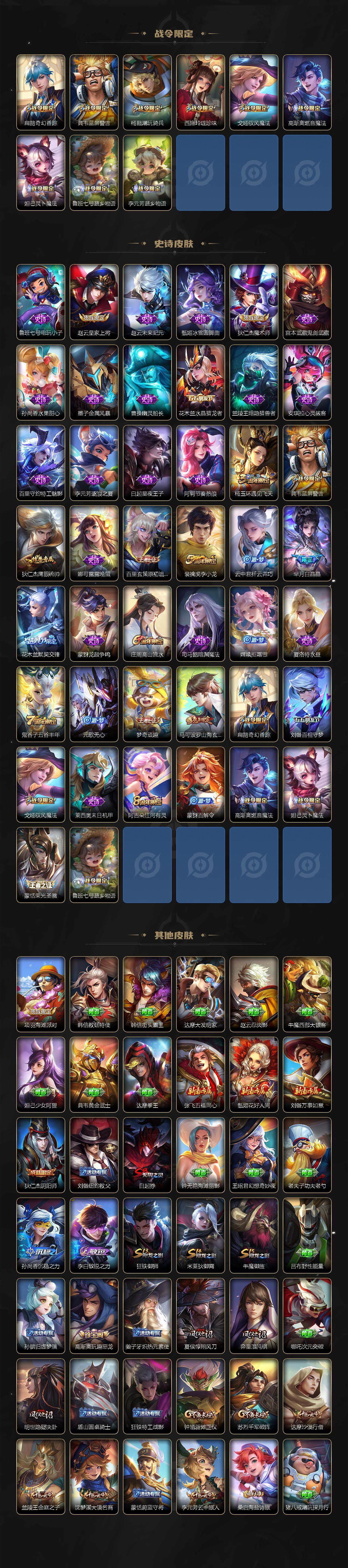 【限定皮肤】:白起狰,狄仁杰阴阳师,赵云皇家上将,庄周高山流水,高渐离玩趣恶龙,扁鹊奇幻香踪,芈月白晶晶,元歌无心,夏侯惇朔风刀,典韦蓝屏警告,马可波罗山海玄木吟,狄仁杰魔术师,达摩沙漠行僧,项羽海滩派对,兰陵王金庭之子,花木兰默契交锋,牛魔御旌,刘备百相守梦,李元芳云中旅人,钟馗驱傩正仪,杨玉环遇见飞天,杨戬潮玩骑兵,鬼谷子五谷丰年,诸葛亮时雨天司,苏烈千军破阵,百里玄策原初追逐者,弈星混沌棋,梦奇顽趣,沈梦溪大漠名商,明世隐疑决卦,裴擒虎李小龙,裴擒虎擒涛扼浪,狂铁御狮,米莱狄御霄,云中君纤云弄巧,伽罗炽翼辉光,嫦娥拒霜思,西施玲珑珍味,鲁班大师探海日志,桑启海盐诗旅,戈娅驭风魔法,阿古朵江河有灵,张良古海寻踪,蒙犽百解令,蒙恬荣光圣徽,高渐离燃音魔法,妲己灵卜魔法,鬼谷子天穹祈灯,孙策乘龙淬吴钩,貂蝉曦玄引,沈梦溪龙舞盛年,鲁班七号蔬乡物语,李元芳蔬乡物语,刘邦剑破天穹