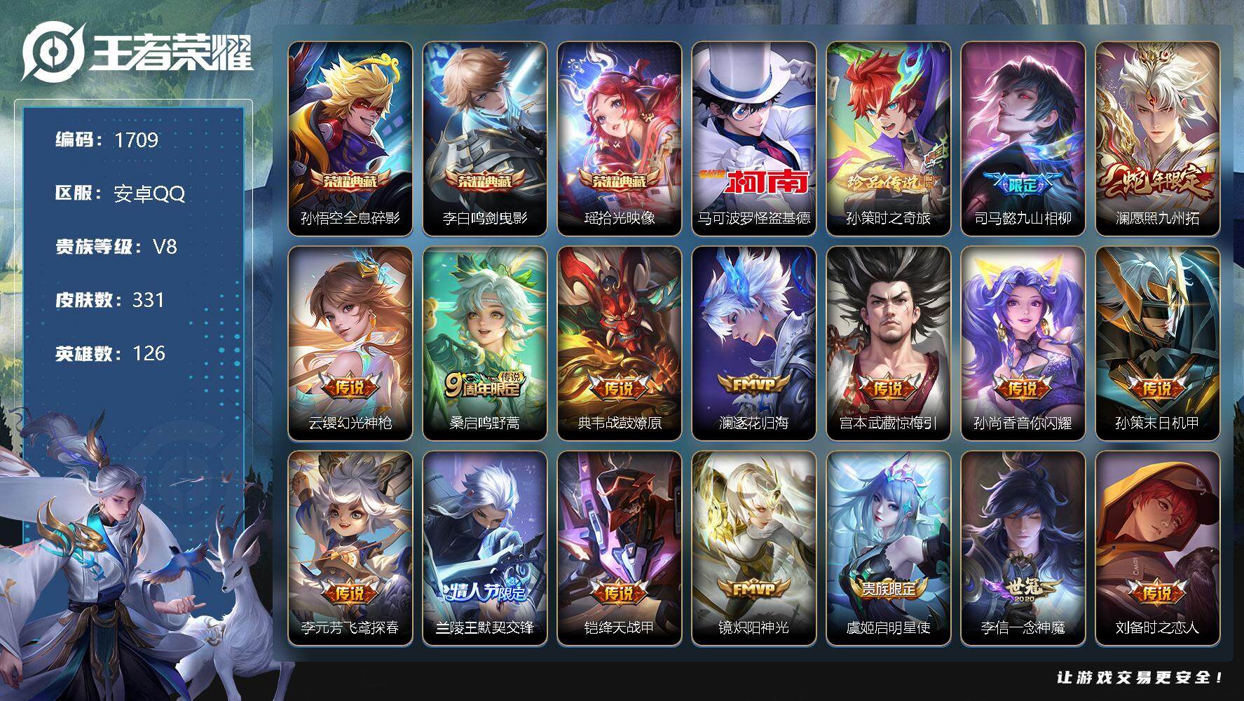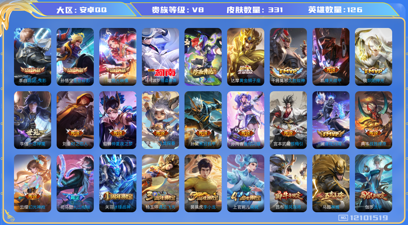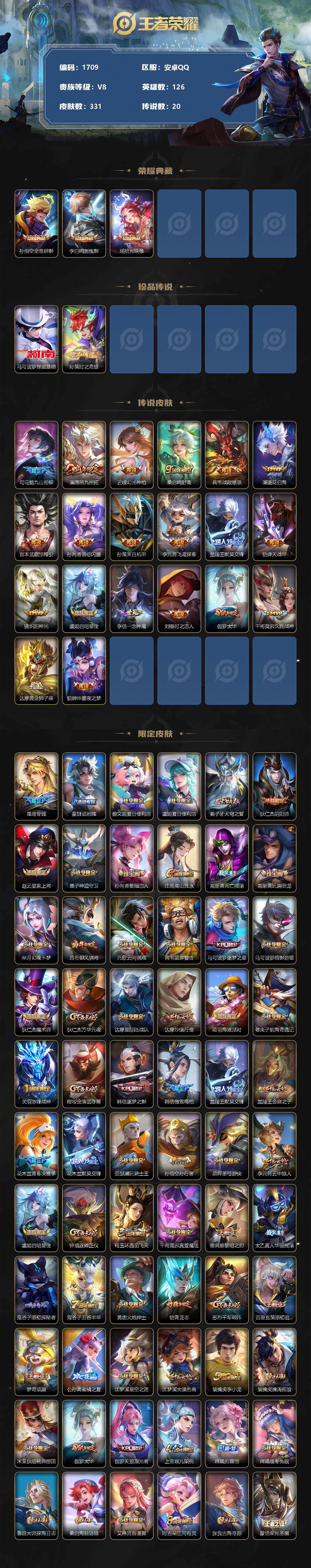 [12101519]【商品标题】:安卓Q-V8-永恒钻石I段位-126英雄-331皮肤-3典藏-0珍品无双-0无双-2珍品传说-20传说-109史诗