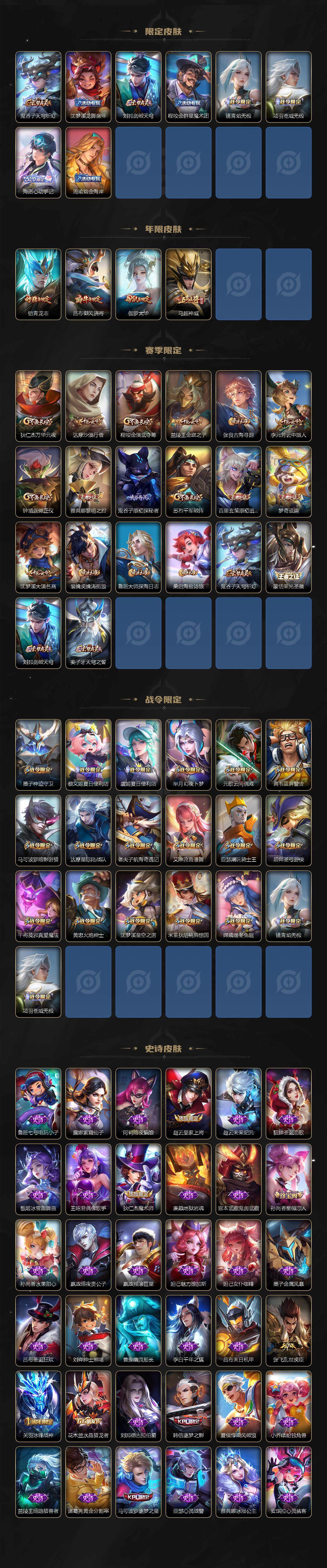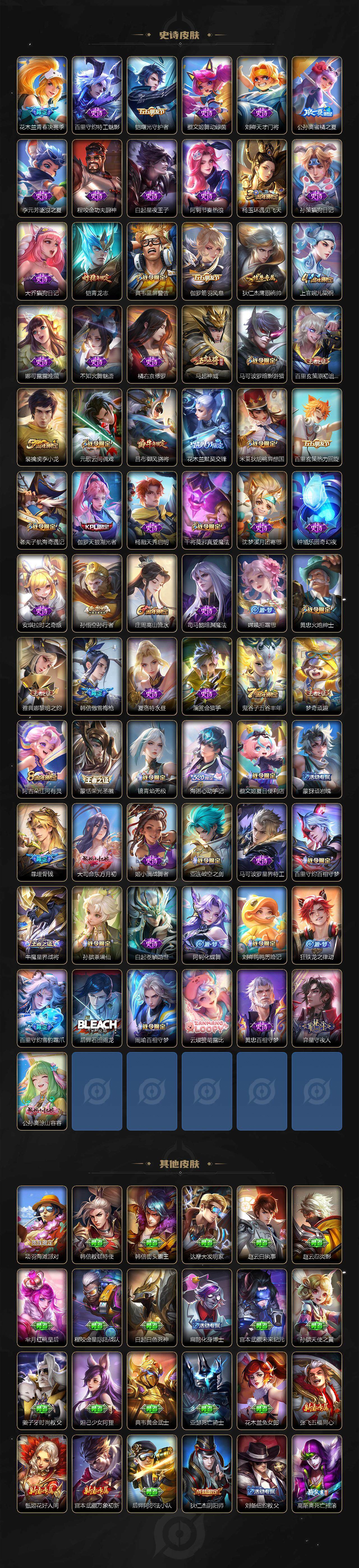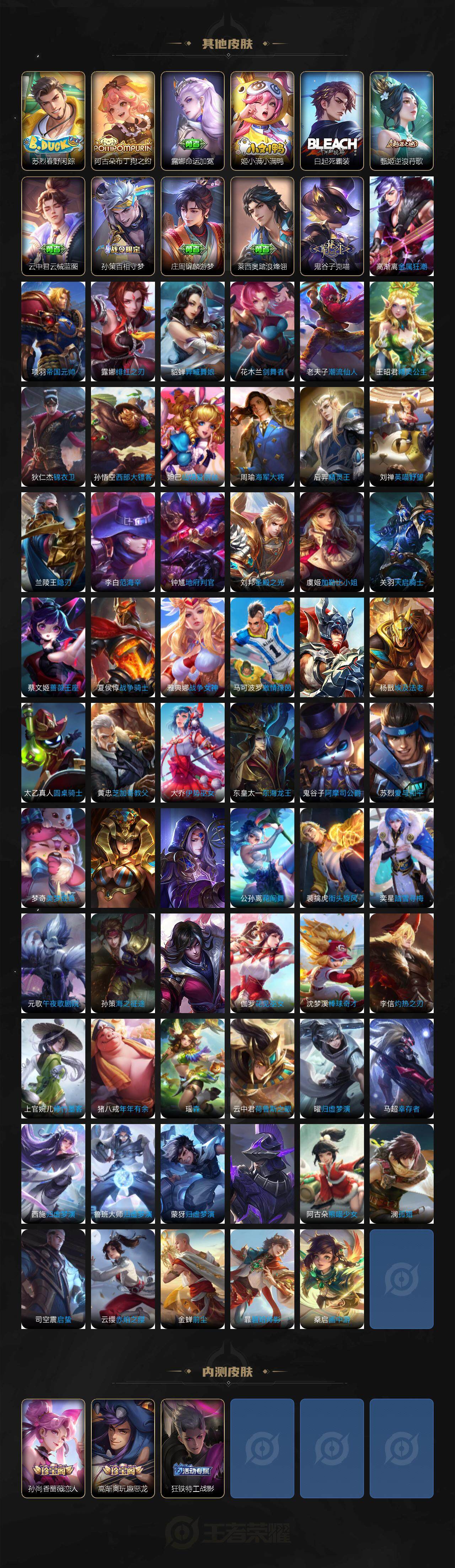 【限定皮肤】:暃埋骨钱,蒙犽顽岩魄,蔡文姬夏日便利店,虞姬夏日便利店,姜子牙天穹之誓,狄仁杰阴阳师,赵云皇家上将,墨子神迹守卫,孙尚香蔷薇恋人,庄周高山流水,高渐离死亡摇滚,高渐离玩趣恶龙,芈月幻夜卜梦,吕布御风骁将,元歌云间偶戏,典韦蓝屏警告,马可波罗逐梦之星,马可波罗暗影游猎,狄仁杰魔术师,狄仁杰万华元夜,达摩星际陆战队,达摩沙漠行僧,项羽海滩派对,老夫子航海奇遇记,关羽冰锋战神,程咬金演武夺筹,韩信逐梦之影,韩信傲雪梅枪,兰陵王默契交锋,兰陵王金庭之子,花木兰青春决赛季,花木兰默契交锋,亚瑟潮玩骑士王,孙悟空孙行者,后羿圣弓游侠,李元芳云中旅人,虞姬启明星使,钟馗驱傩正仪,杨玉环遇见飞天,干将莫邪真爱魔法,雅典娜黎明之约,太乙真人华丽摇滚,鬼谷子原初探秘者,鬼谷子五谷丰年,黄忠火炮绅士,铠青龙志,苏烈千军破阵,百里玄策原初追逐者,梦奇顽趣,公孙离蜜橘之夏,沈梦溪星空之诺,沈梦溪大漠名商,裴擒虎李小龙,裴擒虎擒涛扼浪,米莱狄胡桃异想国,伽罗太华,伽罗天狼溯光者,上官婉儿梁祝,嫦娥拒霜思,嫦娥暖冬兔眠,鲁班大师探海日志,桑启海盐诗旅,艾琳流音漫舞,阿古朵江河有灵,张良古海寻踪,蒙恬荣光圣徽,鬼谷子天穹祈灯,沈梦溪龙舞盛年,刘邦剑破天穹,程咬金群星魔术团,镜青焰无极,项羽苍威无极,海诺心动手记,周瑜熔金海岸