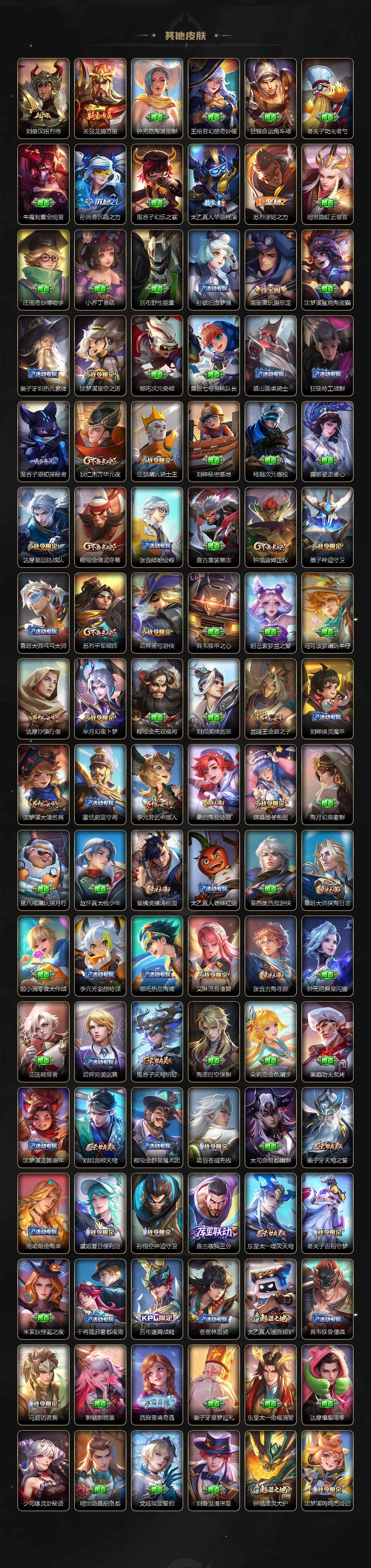 娜可露露晚萤,伽罗箭羽风息,李元芳逐浪之夏,不知火舞魅语,大乔猫狗日记,孙策猫狗日记,阿轲节奏热浪,露娜紫霞仙子,诸葛亮黄金分割率,王昭君偶像歌手,阿轲暗夜猫娘,雅典娜冰冠公主,吕布末日机甲,鲁班七号电玩小子,橘右京修罗,嬴政摇滚巨星,刘禅绅士熊喵,刘禅天才门将,白起星夜王子,安琪拉心灵骇客,安琪拉时之奇旅,程咬金功夫厨神,刘邦德古拉伯爵,兰陵王暗隐猎兽者,曹操幽灵船长,宫本武藏鬼剑武藏,司马懿暗渊魔法,亚瑟心灵战警,钟馗乐园奇幻夜,杨戬天秀·启明,蔡文姬舞动绿茵,廉颇地狱岩魂,小乔缤纷独角兽,夏侯惇乘风破浪,花木兰水晶猎龙者,铠曙光守护者,百里玄策热力回旋,墨子金属风暴,百里玄策原初追逐者,吕布圣诞狂欢,貂蝉圣诞恋歌,百里守约特工魅影,嬴政暗夜贵公子,嫦娥拒霜思,雅典娜黎明之约,李白千年之狐,夏洛特永昼,澜赏金猎手,海诺心动手记,白起苍鳞隐世