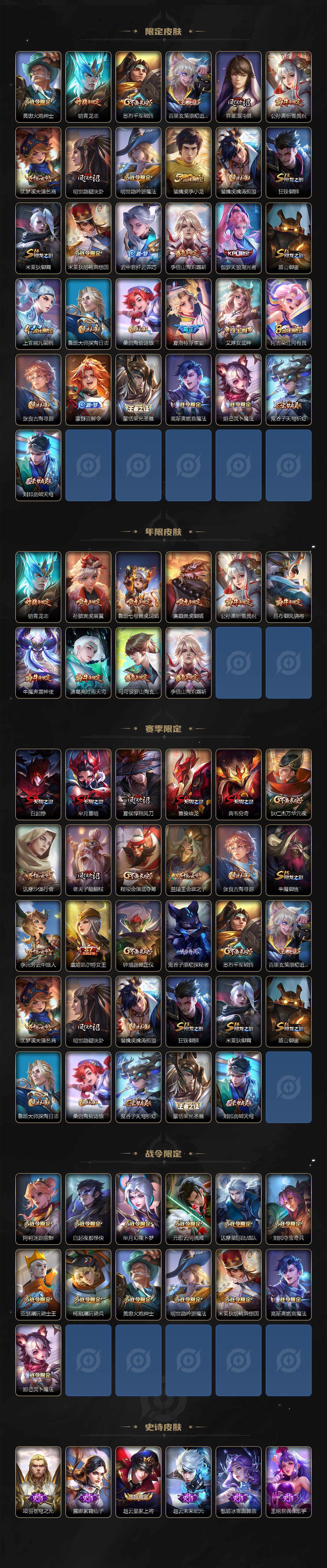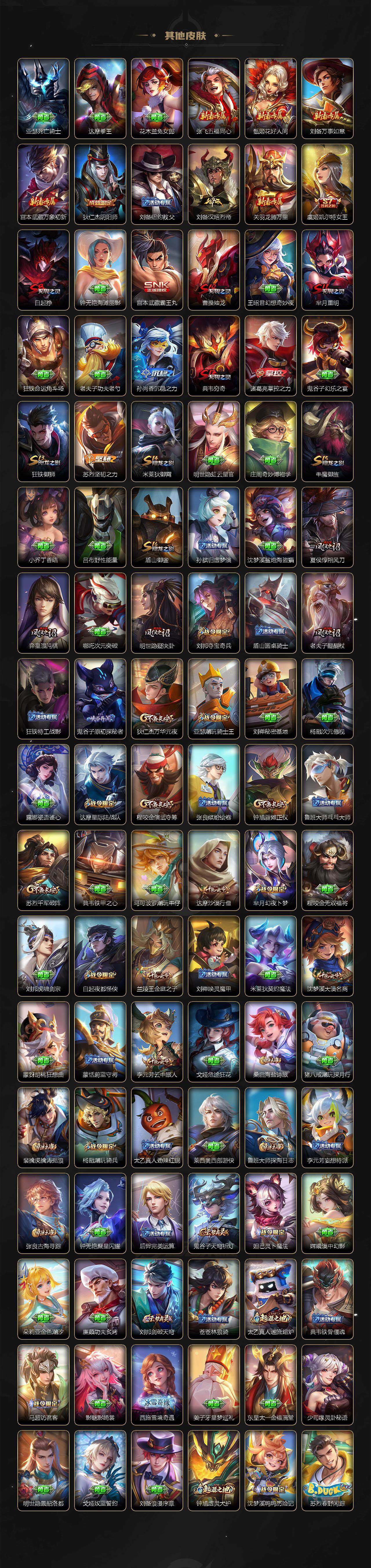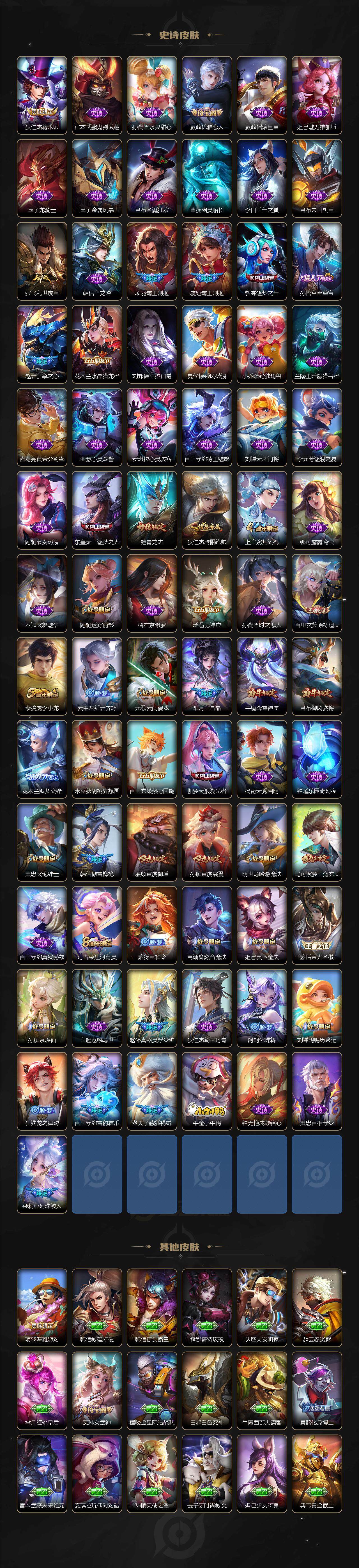 【限定皮肤】:白起狰,狄仁杰阴阳师,虞姬凯尔特女王,廉颇寅虎御盾,赵云皇家上将,赵云引擎之心,嬴政优雅恋人,鲁班七号寅虎瑞焰,阿轲迷踪丽影,孙膑寅虎展翼,白起夜都怪侠,芈月重明,芈月白晶晶,芈月幻夜卜梦,吕布御风骁将,元歌云间偶戏,夏侯惇朔风刀,曹操烛龙,典韦穷奇,马可波罗山海玄木吟,马可波罗妄想实况,狄仁杰魔术师,狄仁杰万华元夜,达摩星际陆战队,达摩沙漠行僧,项羽海滩派对,项羽霸王别姬,老夫子醍醐杖,貂蝉逐梦之音,程咬金演武夺筹,刘邦夺宝奇兵,韩信傲雪梅枪,兰陵王默契交锋,兰陵王金庭之子,花木兰默契交锋,亚瑟潮玩骑士王,孙悟空至尊宝,孙悟空齐天大圣,牛魔御旌,牛魔奔雷神使,李元芳云中旅人,虞姬霸王别姬,虞姬启明星使,钟馗驱傩正仪,杨戬潮玩骑兵,东皇太一逐梦之光,鬼谷子原初探秘者,诸葛亮时雨天司,黄忠火炮绅士,铠青龙志,苏烈千军破阵,百里玄策原初追逐者,弈星混沌棋,公孙离祈雪灵祝,沈梦溪大漠名商,明世隐疑决卦,明世隐吟游魔法,裴擒虎李小龙,裴擒虎擒涛扼浪,狂铁御狮,米莱狄御霄,米莱狄胡桃异想国,云中君纤云弄巧,李信山海炽霜斩,伽罗天狼溯光者,盾山御銮,上官婉儿梁祝,鲁班大师探海日志,桑启海盐诗旅,夏洛特浮生妄,艾琳女武神,阿古朵江河有灵,张良古海寻踪,蒙犽百解令,蒙恬荣光圣徽,高渐离燃音魔法,妲己灵卜魔法,鬼谷子天穹祈灯,刘邦剑破天穹