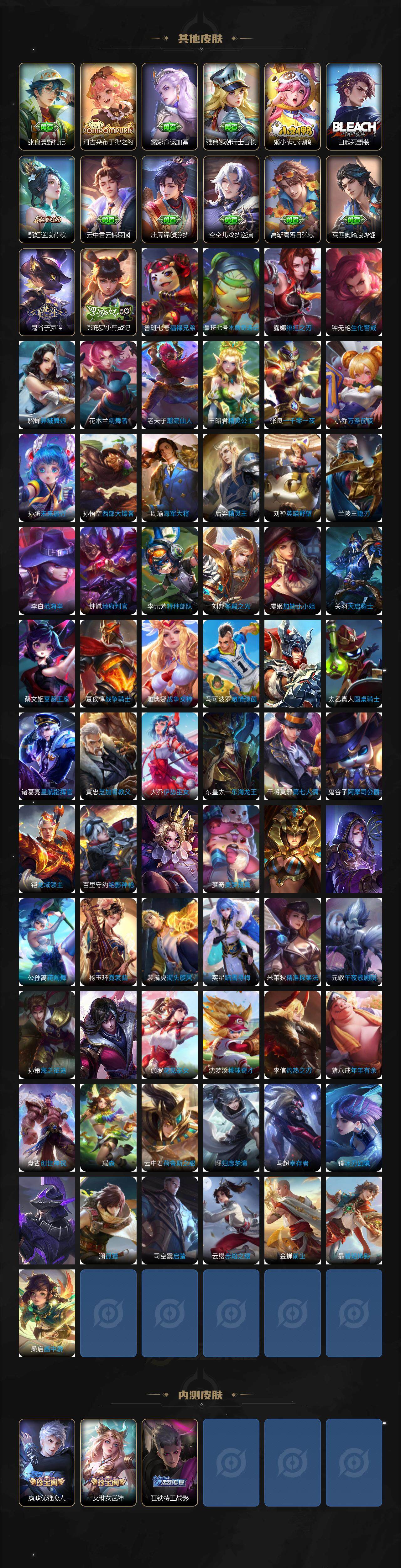 虞姬凯尔特女王,白起狰,曹操烛龙,芈月重明,典韦穷奇,狂铁御狮,米莱狄御霄,牛魔御旌,盾山御銮,夏侯惇朔风刀,明世隐疑决卦,老夫子醍醐杖,鬼谷子原初探秘者,狄仁杰万华元夜,程咬金演武夺筹,钟馗驱傩正仪,苏烈千军破阵,刘邦夺宝奇兵,元歌云间偶戏,弈星混沌棋,达摩沙漠行僧,兰陵王金庭之子,沈梦溪大漠名商,李元芳云中旅人,桑启海盐诗旅,裴擒虎擒涛扼浪,鲁班大师探海日志,张良古海寻踪