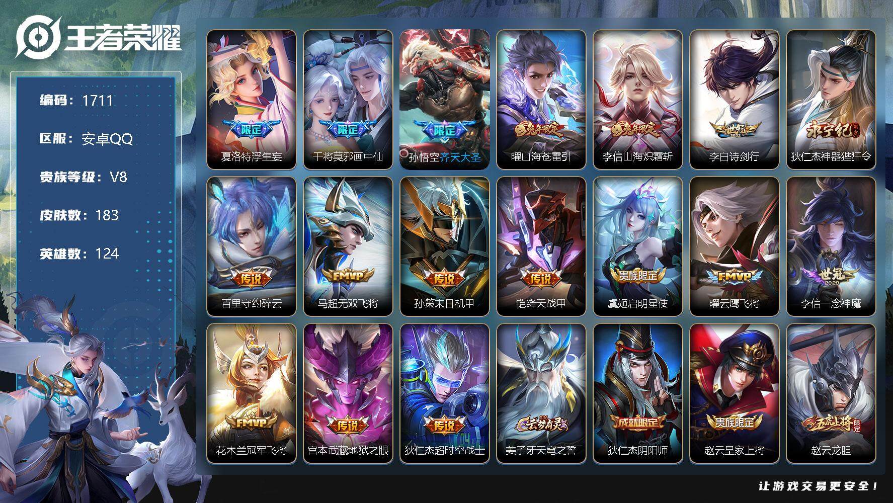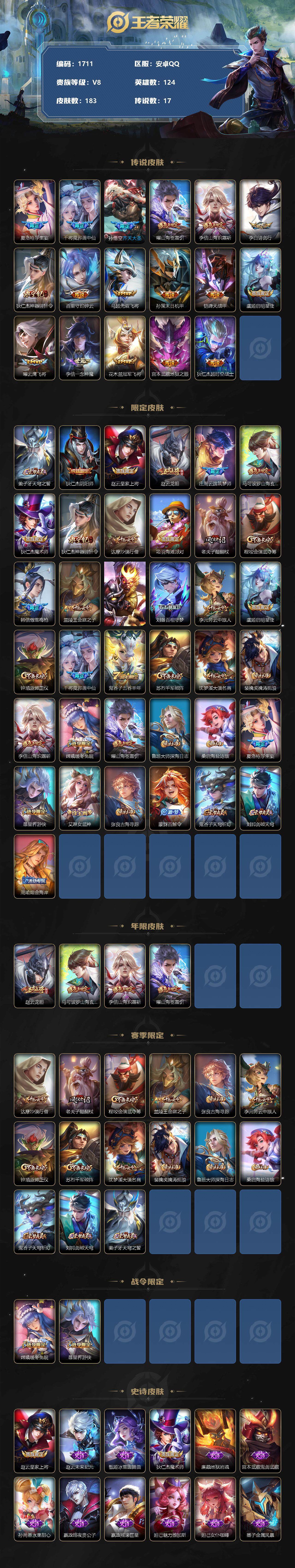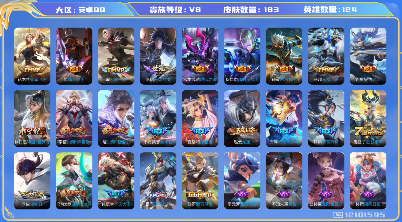 [12101595]【商品标题】:安卓Q-V8-尊贵铂金II段位-124英雄-183皮肤-0典藏-0珍品无双-0无双-0珍品传说-17传说-42史诗