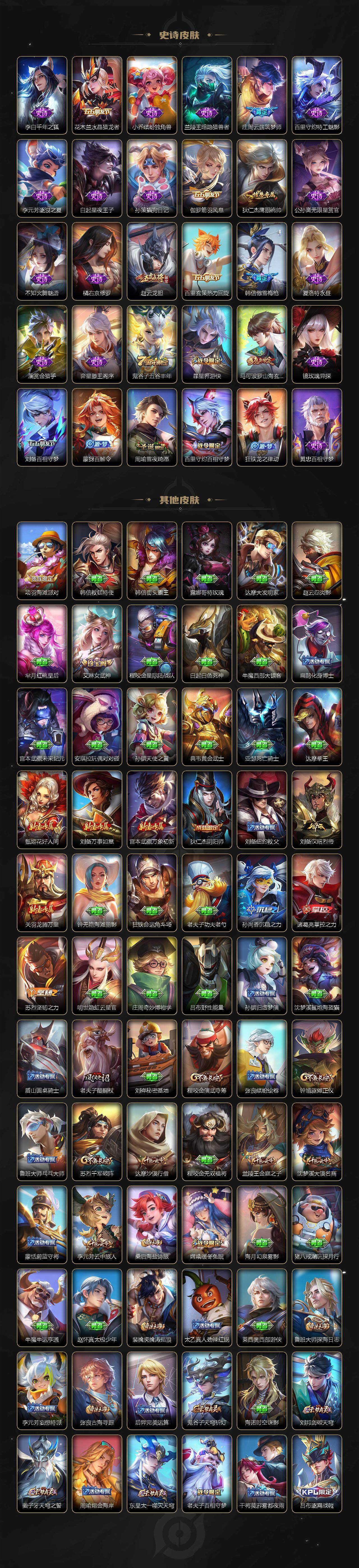 【史诗皮肤】:赵云皇家上将,赵云未来纪元,甄姬冰雪圆舞曲,狄仁杰魔术师,廉颇地狱岩魂,宫本武藏鬼剑武藏,孙尚香水果甜心,嬴政暗夜贵公子,嬴政摇滚巨星,妲己魅力维加斯,妲己女仆咖啡,墨子金属风暴,李白千年之狐,花木兰水晶猎龙者,小乔缤纷独角兽,兰陵王暗隐猎兽者,庄周云端筑梦师,百里守约特工魅影,李元芳逐浪之夏,白起星夜王子,孙策猫狗日记,伽罗箭羽风息,狄仁杰鹰眼统帅,公孙离无限星赏官,不知火舞魅语,橘右京修罗,赵云龙胆,百里玄策热力回旋,韩信傲雪梅枪,夏洛特永昼,澜赏金猎手,弈星滕王阁序,鬼谷子五谷丰年,暃星界游侠,马可波罗山海玄木吟,镜玫瑰异探,刘备百相守梦,蒙犽百解令,周瑜雪夜绮愿,百里守约百相守梦,狂铁龙之律动,黄忠百相守梦