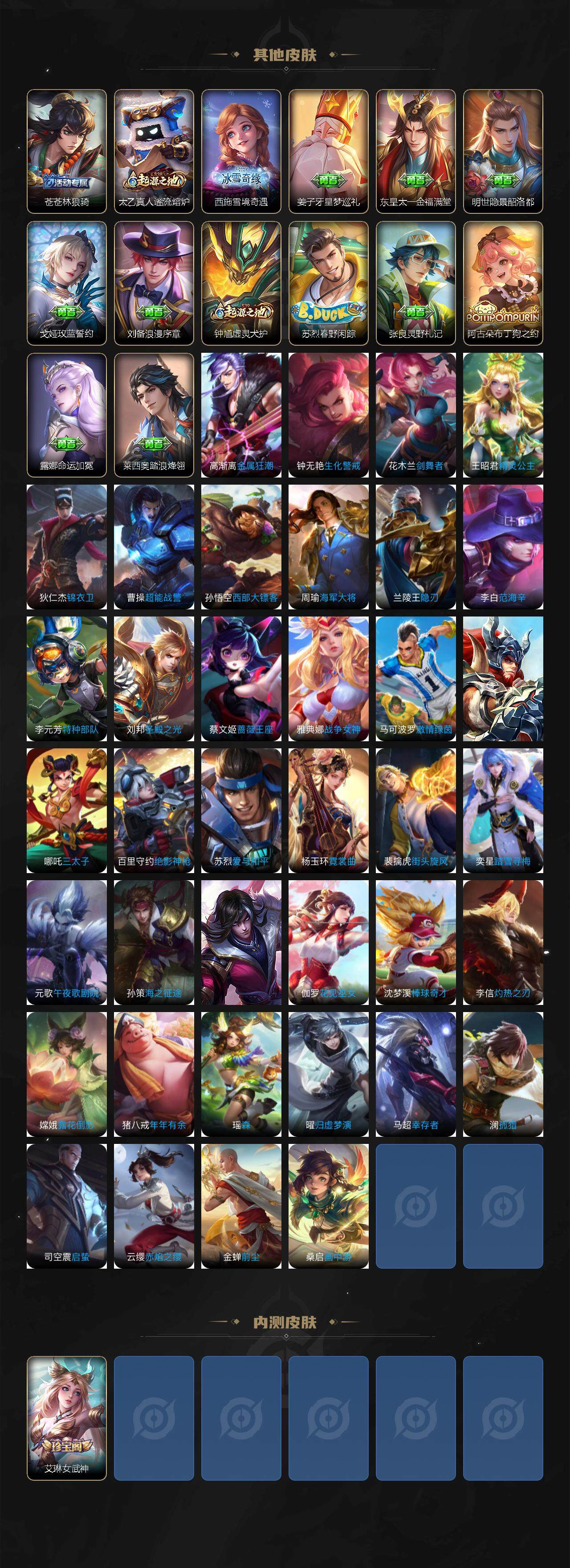 【限定皮肤】:姜子牙天穹之誓,狄仁杰阴阳师,赵云皇家上将,赵云龙胆,庄周云端筑梦师,马可波罗山海玄木吟,狄仁杰魔术师,狄仁杰神器狴犴令,达摩沙漠行僧,项羽海滩派对,老夫子醍醐杖,程咬金演武夺筹,韩信傲雪梅枪,兰陵王金庭之子,孙悟空齐天大圣,刘备百相守梦,李元芳云中旅人,虞姬启明星使,钟馗驱傩正仪,干将莫邪画中仙,鬼谷子五谷丰年,苏烈千军破阵,沈梦溪大漠名商,裴擒虎擒涛扼浪,李信山海炽霜斩,嫦娥暖冬兔眠,曜山海苍雷引,鲁班大师探海日志,桑启海盐诗旅,夏洛特浮生妄,暃星界游侠,艾琳女武神,张良古海寻踪,蒙犽百解令,鬼谷子天穹祈灯,刘邦剑破天穹,周瑜熔金海岸