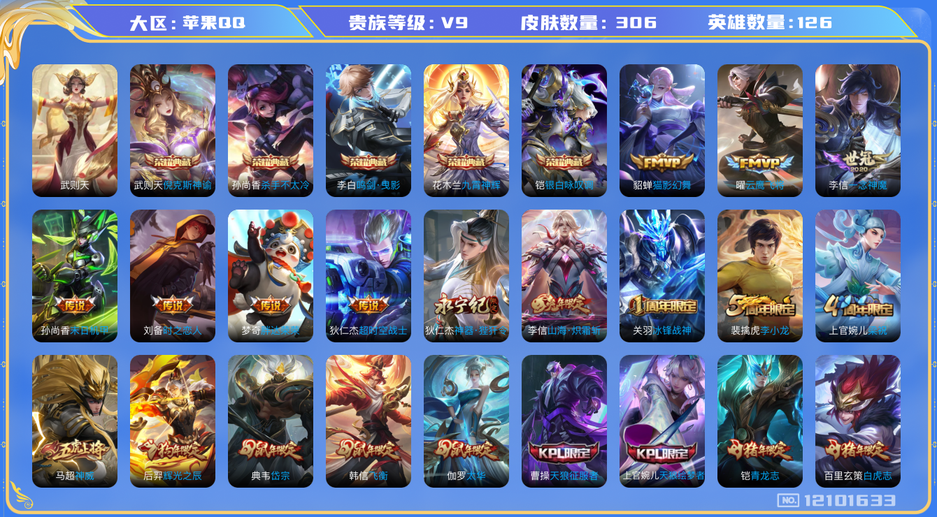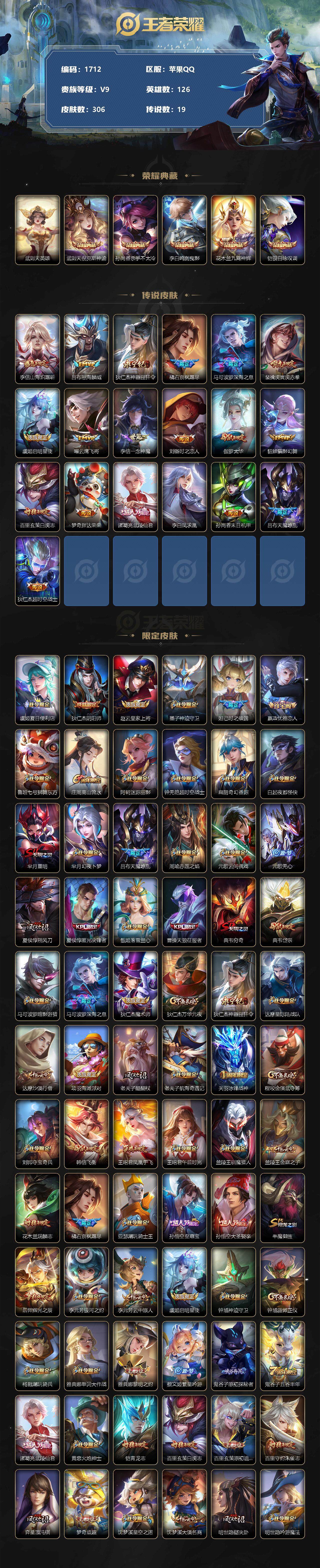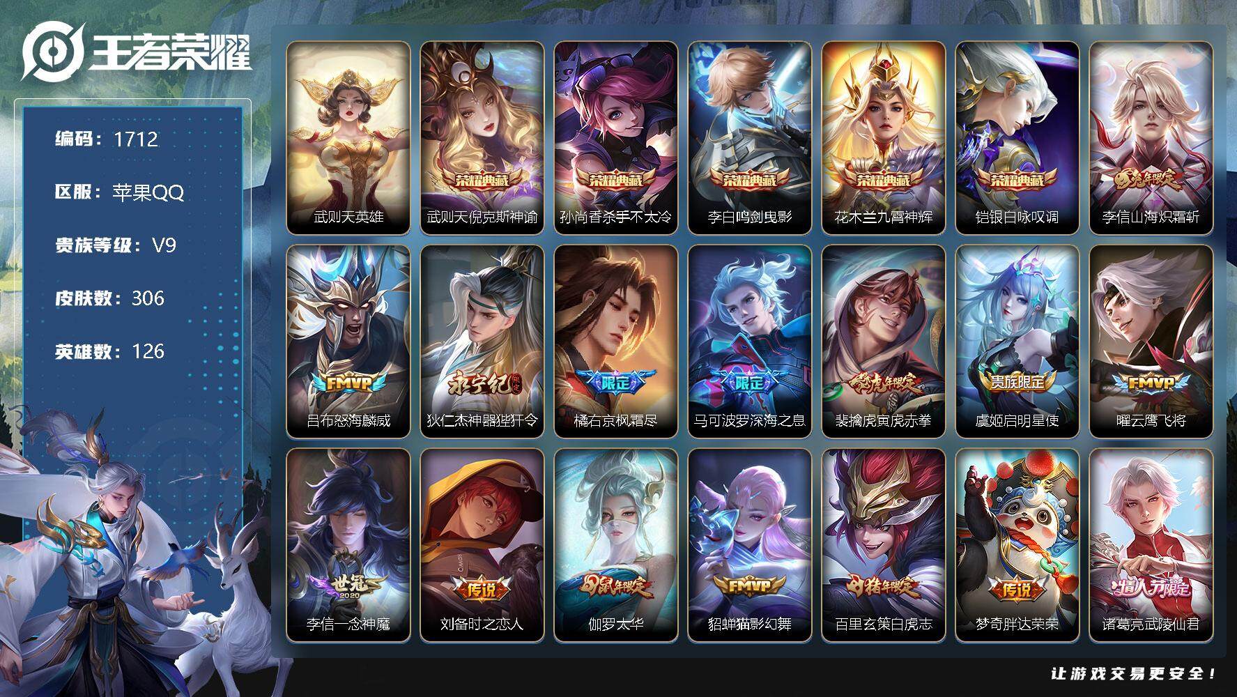 [12101633]【商品标题】:苹果Q-V9-永恒钻石IV段位-126英雄-306皮肤-5典藏-0珍品无双-0无双-0珍品传说-19传说-89史诗