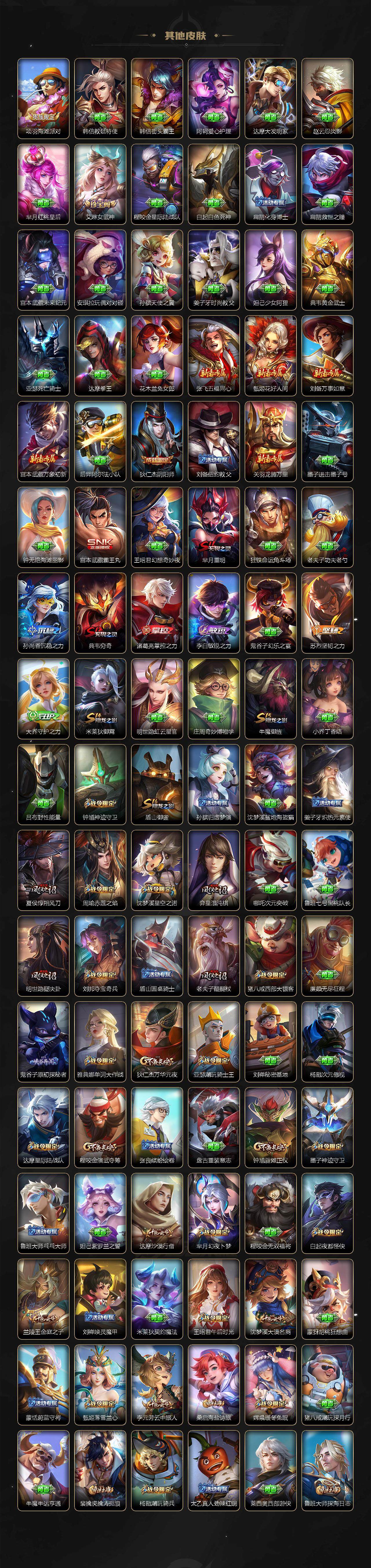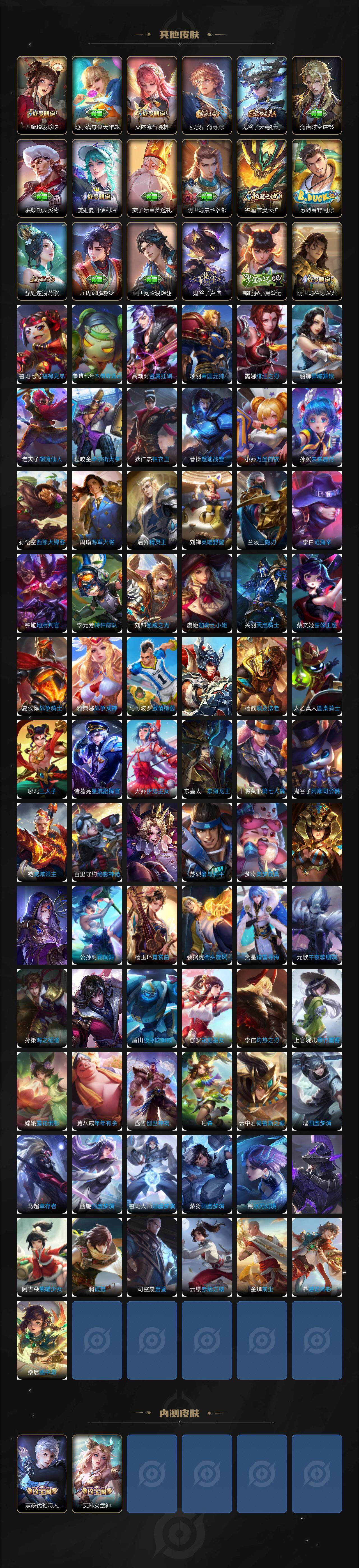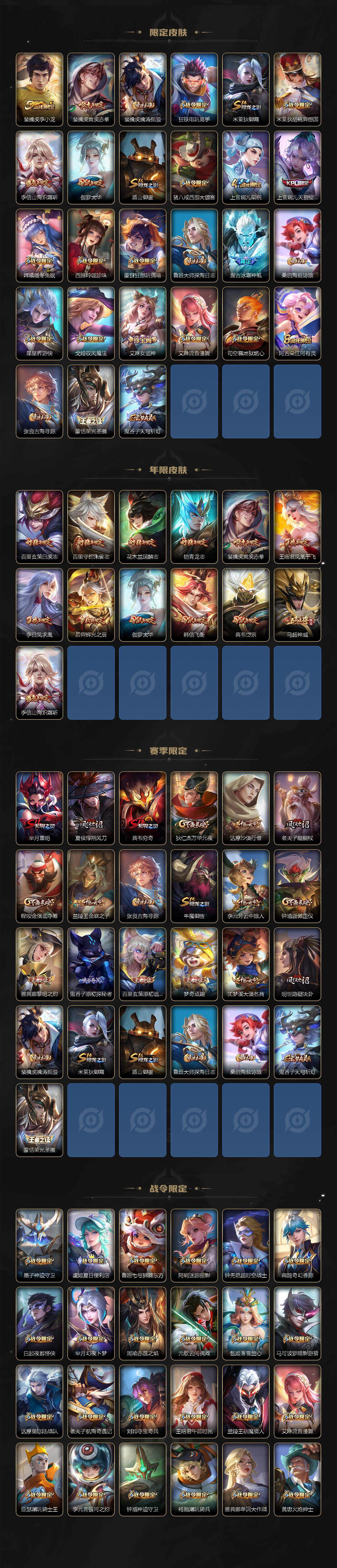 【限定皮肤】:虞姬夏日便利店,狄仁杰阴阳师,赵云皇家上将,墨子神迹守卫,妲己时之彼端,嬴政优雅恋人,鲁班七号狮舞东方,庄周高山流水,阿轲迷踪丽影,钟无艳超时空战士,扁鹊奇幻香踪,白起夜都怪侠,芈月重明,芈月幻夜卜梦,吕布天魔缭乱,周瑜赤莲之焰,元歌云间偶戏,元歌无心,夏侯惇朔风刀,夏侯惇匿光决锋者,甄姬落雪兰心,曹操天狼征服者,典韦穷奇,典韦岱宗,马可波罗暗影游猎,马可波罗深海之息,狄仁杰魔术师,狄仁杰万华元夜,狄仁杰神器狴犴令,达摩星际陆战队,达摩沙漠行僧,项羽海滩派对,老夫子醍醐杖,老夫子航海奇遇记,关羽冰锋战神,程咬金演武夺筹,刘邦夺宝奇兵,韩信飞衡,王昭君凤凰于飞,王昭君午后时光,兰陵王驯魔猎人,兰陵王金庭之子,花木兰瑞麟志,橘右京枫霜尽,亚瑟潮玩骑士王,孙悟空至尊宝,孙悟空大圣娶亲,牛魔御旌,后羿辉光之辰,李元芳银河之约,李元芳云中旅人,虞姬启明星使,钟馗神迹守卫,钟馗驱傩正仪,杨戬潮玩骑兵,雅典娜单词大作战,雅典娜黎明之约,蔡文姬繁星吟游,鬼谷子原初探秘者,鬼谷子五谷丰年,诸葛亮武陵仙君,黄忠火炮绅士,铠青龙志,百里玄策白虎志,百里玄策原初追逐者,百里守约朱雀志,弈星混沌棋,梦奇顽趣,沈梦溪星空之诺,沈梦溪大漠名商,明世隐疑决卦,明世隐吟游魔法,裴擒虎李小龙,裴擒虎寅虎赤拳,裴擒虎擒涛扼浪,狂铁电玩高手,米莱狄御霄,米莱狄胡桃异想国,李信山海炽霜斩,伽罗太华,盾山御銮,猪八戒西部大镖客,上官婉儿梁祝,上官婉儿天狼绘梦者,嫦娥暖冬兔眠,西施玲珑珍味,蒙犽狂想玩偶喵,鲁班大师探海日志,盘古冰霜神祇,桑启海盐诗旅,暃星界游侠,戈娅驭风魔法,艾琳女武神,艾琳流音漫舞,司空震地狱燃心,阿古朵江河有灵,张良古海寻踪,蒙恬荣光圣徽,鬼谷子天穹祈灯
