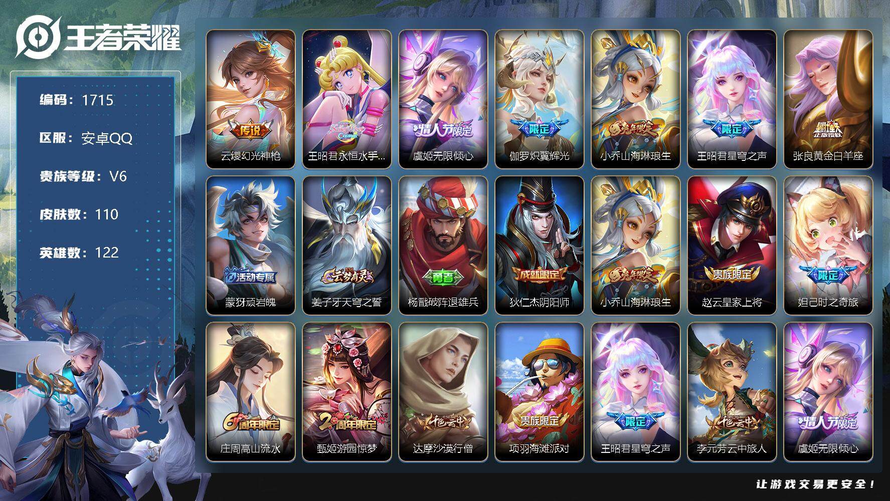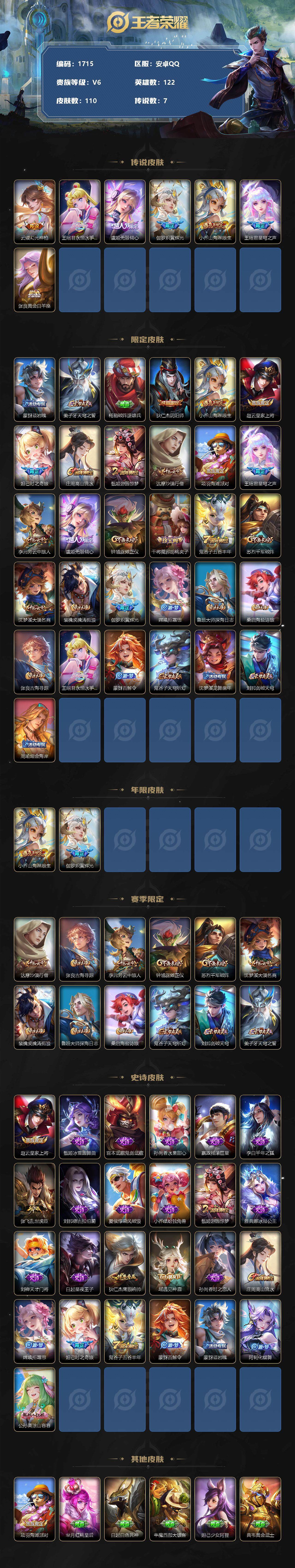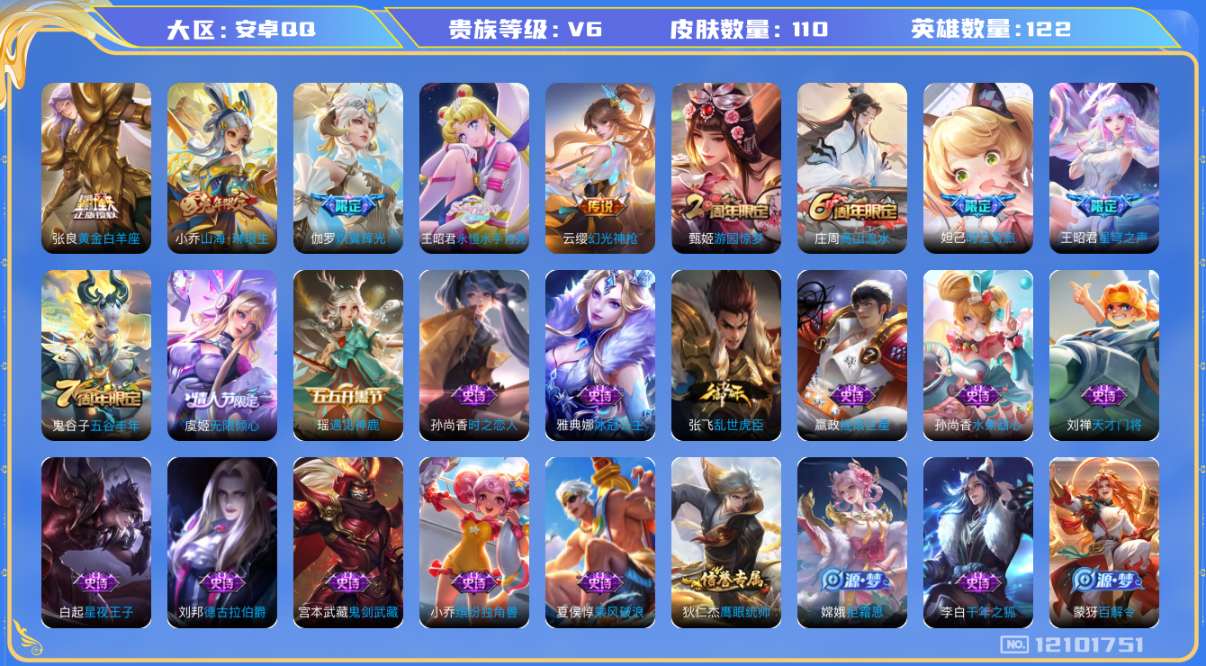 [12101751]【商品标题】:安卓Q-V5-荣耀黄金I段位-122英雄-110皮肤-0典藏-0珍品无双-0无双-0珍品传说-7传说-25史诗