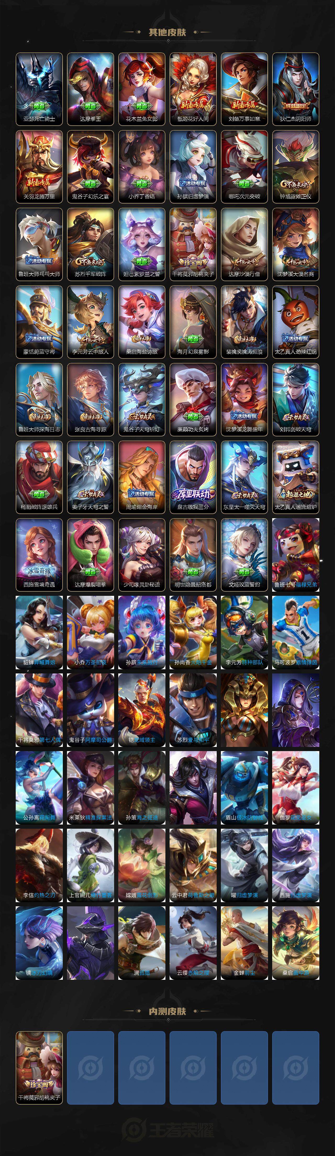 【其他皮肤】:项羽海滩派对,芈月红桃皇后,白起白色死神,牛魔西部大镖客,妲己少女阿狸,典韦黄金武士,亚瑟死亡骑士,达摩拳王,花木兰兔女郎,甄姬花好人间,刘备万事如意,狄仁杰阴阳师,关羽龙腾万里,鬼谷子幻乐之宴,小乔丁香结,孙膑归虚梦演,哪吒次元突破,钟馗驱傩正仪,鲁班大师乓乓大师,苏烈千军破阵,妲己紫罗兰之誓,干将莫邪胡桃夹子,达摩沙漠行僧,沈梦溪大漠名商,蒙恬蔚蓝守将,李元芳云中旅人,桑启海盐诗旅,海月幻泉雾影,裴擒虎擒涛扼浪,太乙真人劲辣红锅,鲁班大师探海日志,张良古海寻踪,鬼谷子天穹祈灯,廉颇功夫炙烤,沈梦溪龙舞盛年,刘邦剑破天穹,杨戬破阵退雄兵,姜子牙天穹之誓,周瑜熔金海岸,盘古敬我三分,东皇太一噬灭天穹,太乙真人谧流熔炉,西施雪境奇遇,