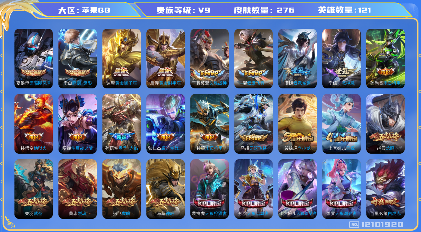 [12101920]【商品标题】:苹果Q-V7-永恒钻石V段位-121英雄-276皮肤-2典藏-0珍品无双-0无双-0珍品传说-18传说-70史诗