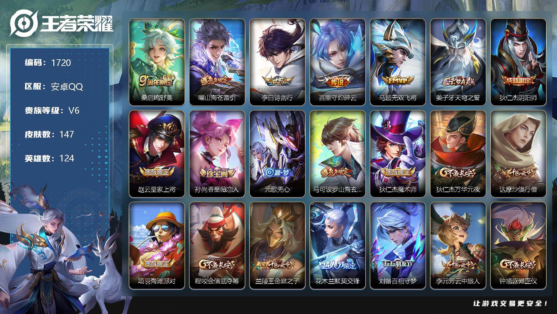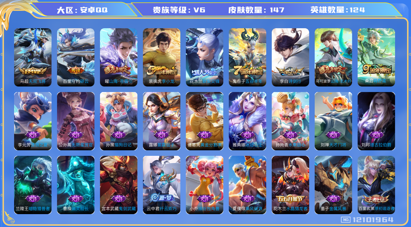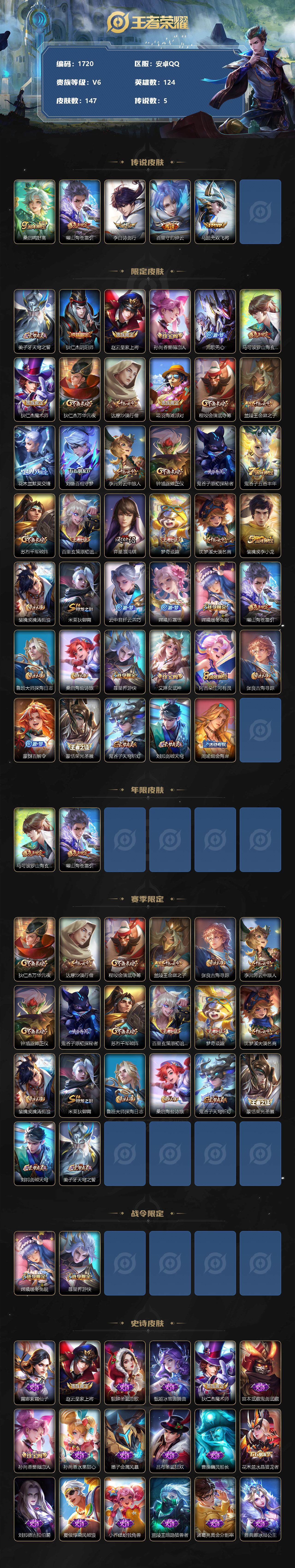 [12101964]【商品标题】:安卓Q-V0-永恒钻石III段位-124英雄-147皮肤-0典藏-0珍品无双-0无双-0珍品传说-5传说-41史诗