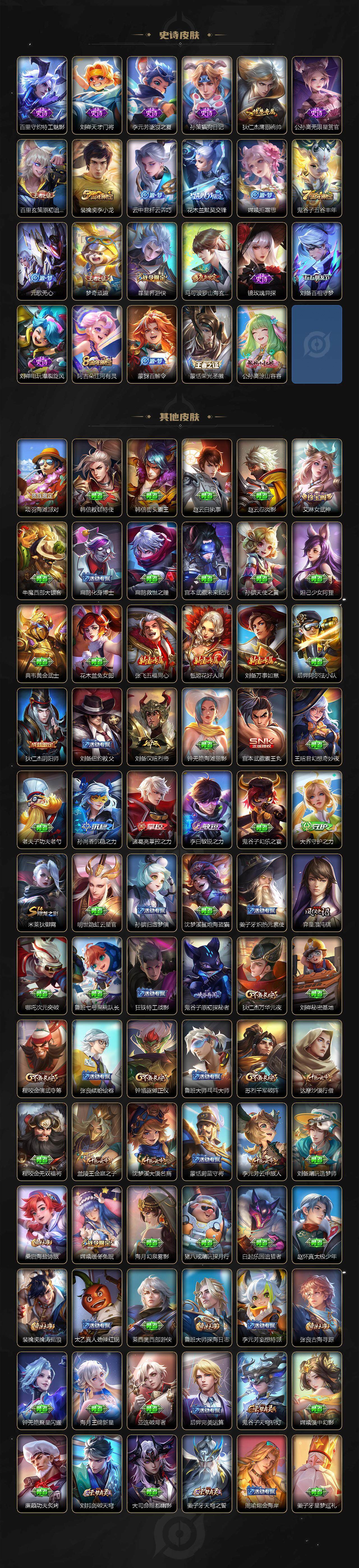 【史诗皮肤】:露娜紫霞仙子,赵云皇家上将,貂蝉圣诞恋歌,甄姬冰雪圆舞曲,狄仁杰魔术师,宫本武藏鬼剑武藏,孙尚香蔷薇恋人,孙尚香水果甜心,墨子金属风暴,吕布圣诞狂欢,曹操幽灵船长,花木兰水晶猎龙者,刘邦德古拉伯爵,夏侯惇乘风破浪,小乔缤纷独角兽,兰陵王暗隐猎兽者,诸葛亮黄金分割率,雅典娜冰冠公主,百里守约特工魅影,刘禅天才门将,李元芳逐浪之夏,孙策猫狗日记,狄仁杰鹰眼统帅,公孙离无限星赏官,百里玄策原初追逐者,裴擒虎李小龙,云中君纤云弄巧,花木兰默契交锋,嫦娥拒霜思,鬼谷子五谷丰年,元歌无心,梦奇顽趣,暃星界游侠,马可波罗山海玄木吟,镜玫瑰异探,刘备百相守梦,刘禅电玩爆裂旋风,阿古朵江河有灵,蒙犽百解令,蒙恬荣光圣徽,公孙离涂山容容