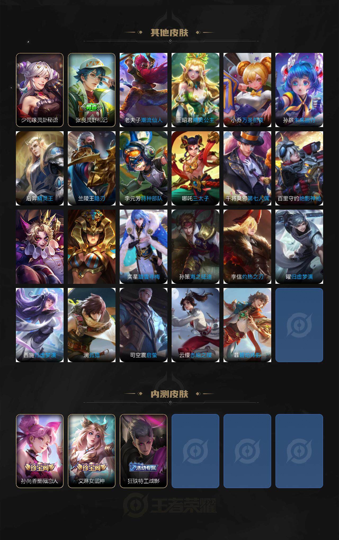【赛季限定】:狄仁杰万华元夜,达摩沙漠行僧,程咬金演武夺筹,兰陵王金庭之子,张良古海寻踪,李元芳云中旅人,钟馗驱傩正仪,鬼谷子原初探秘者,苏烈千军破阵,百里玄策原初追逐者,弈星混沌棋,梦奇顽趣,沈梦溪大漠名商,裴擒虎擒涛扼浪,米莱狄御霄,鲁班大师探海日志,桑启海盐诗旅,鬼谷子天穹祈灯,蒙恬荣光圣徽,刘邦剑破天穹,姜子牙天穹之誓
