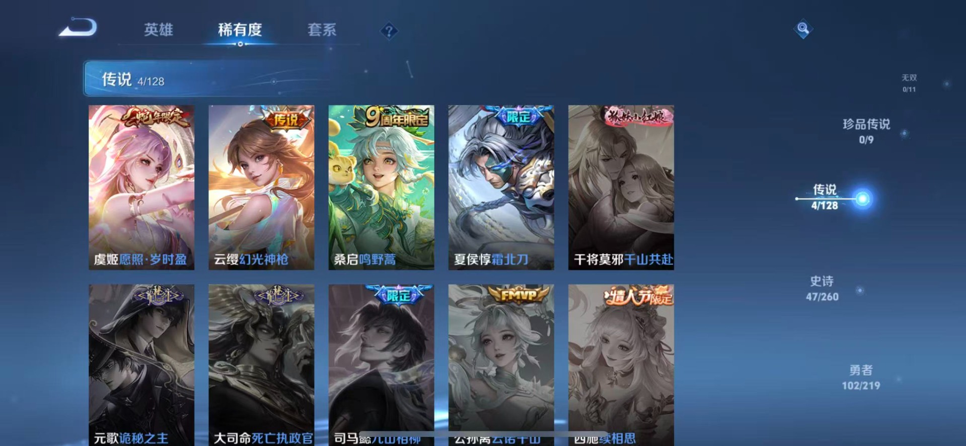 - [11658500]V6 1珍品传说 5传说 124英雄 207皮肤 可修改实名 珍品传说:时之奇旅-孙策 传说皮:幻光神枪,地狱之眼,云鹰飞将(小将军),炽阳神光 珍宝阁皮:妄想食味,蔷薇恋人 限定皮:鸣野蒿,飞衡(韩信年限),遇见飞天,高山流水,五谷丰年,游园惊梦,梁祝,李小龙,猪悟能,大圣娶亲,引擎之心,冰霜恋舞曲 史诗皮:化蝶舞,破空之剑,苍穹之光,电玩小子(小书包),黄金分割率,特工魅影,千年之狐,江河有灵,青蛇,龙骑士(小龙虾),乱世虎臣,修罗,女仆咖啡,水果甜心,天才门将,星夜王子,心灵骇客,功夫厨神,暗隐猎兽者,幽灵船长,鬼剑武藏,心灵战警,舞动绿茵,地狱岩魂,缤纷独角兽,乘风破浪,逐浪之夏,水晶猎龙者,曙光守护者,金属风暴,原初追逐者,圣诞恋歌,鹰眼统帅,黎明之约,无心