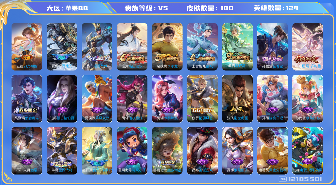 [12105501]V5 4传说 124英雄 180皮肤 可修改实名 传说皮:幻光神枪 珍宝阁皮:优雅恋人,蔷薇恋人 限定皮:愿照·岁时盈(虞姬年限),逐霄战戟,鸣野蒿,夏侯惇霜北刀,至尊宝,高山流水,梁祝,李小龙 史诗皮:器灵·浮梦炉,星界战将,谪仙醉月,蒙犽顽岩魄,蔬乡物语(鲁班七号),紫霞仙子,电玩小子(小书包),黄金分割率,千年之狐,永昼,魅语,高渐离燃音魔法,蒙恬荣光圣徽,冰冠公主,偶像歌手,电玩·爆裂旋风,暗夜猫娘,龙骑士(小龙虾),猫狗日记-孙策,乱世虎臣,节奏热浪,女仆咖啡,摇滚巨星,水果甜心,绅士熊喵,天才门将,功夫厨神,德古拉伯爵,暗隐猎兽者,鬼剑武藏,心灵战警,拒霜思,乘风破浪,水晶猎龙者,箭羽风息,金属风暴,圣诞狂欢,鹰眼统帅