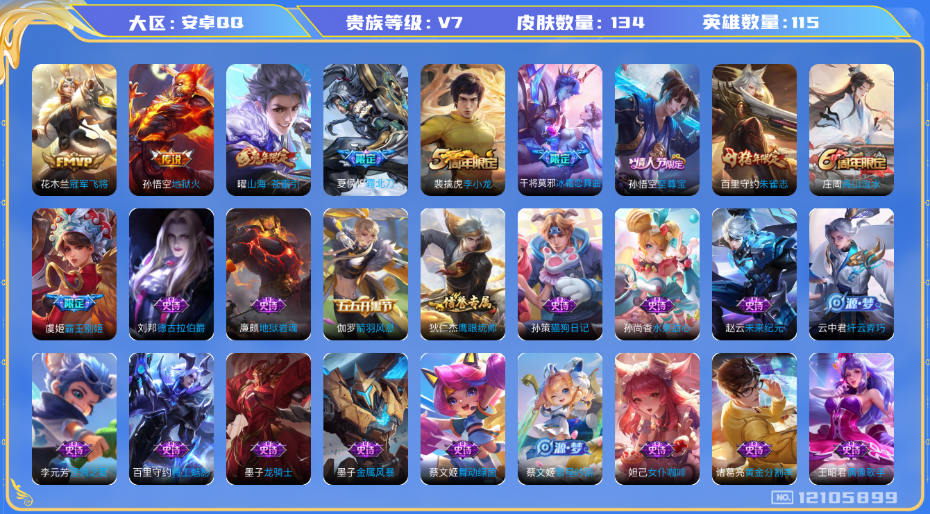 [12105899]V7 4传说 115英雄 134皮肤 可修改实名 优质装备:冠军飞将,地狱火,山海·苍雷引(电光曜子) 珍宝阁皮:玩趣恶龙 限定皮:夏侯惇霜北刀,至尊宝,高山流水,李小龙,朱雀志(守约年限),霸王别姬-虞姬,冰霜恋舞曲 史诗皮:黄金分割率,特工魅影,偶像歌手,龙骑士(小龙虾),猫狗日记-孙策,修罗,女仆咖啡,水果甜心,德古拉伯爵,舞动绿茵,地狱岩魂,纤云弄巧,繁星吟游(呼啦呼啦),逐浪之夏,箭羽风息,金属风暴,鹰眼统帅,未来纪元-赵云