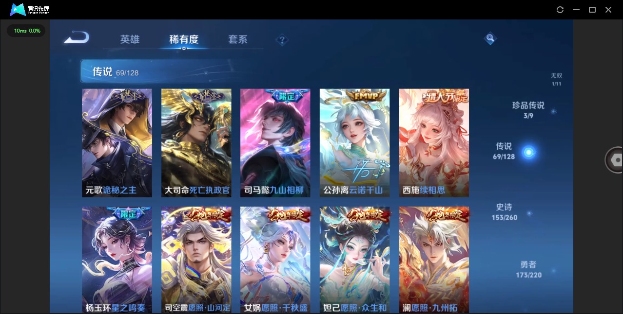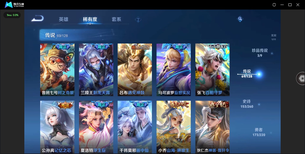 - [12144050]V9 4典藏 21传说 123英雄 280皮肤 典藏英雄武则天 可修改实名 优质装备:天鹅之梦(小乔典藏),倪克斯神谕(宇宙婆娘),活力突击,大秦宣太后,黄金射手座,黄金白羊座,猫影幻舞,末日机甲-孙尚香(绿蚂蚱),零号·赤焰,海洋之心,胖达荣荣,李逍遥,超时空战士-狄仁杰,末日机甲-孙策 珍宝阁皮:蔷薇恋人,女武神 限定皮:梅西,武陵仙君(小桃花),异界灵契(白毛香),补天,时之彼端,白晶晶,时雨天司(水龙头),神威(电光马子),玄嵩(庄周年限),遇见飞天,高山流水,五谷丰年,幽恒(沐浴露),武圣,天狼运算者,游园惊梦,梁祝,逐梦之星,逐梦之音,祈雪灵祝(雪兔子),李小龙,逐梦之影,永曜之星,辉光之辰,如梦令-嫦娥,如梦令-后羿,霸王别姬-虞姬,猪悟能,一生所爱,天魔缭乱,青春决赛季,云端筑梦师,蜜橘之夏,美猴王,寅虎·御盾(廉颇年限),寅虎·心曲(虎婆),寅虎·赤拳(老虎年限),时之祈愿-瑶(瑶传限),玉兔公主 史诗皮:紫霞仙子,苍穹之光,电玩小子(小书包),江河有灵,无限星赏官,冰冠公主,偶像歌手,白蛇,晚萤,暗夜猫娘,猫狗日记-孙策,乱世虎臣,节奏热浪,女仆咖啡,摇滚巨星,水果甜心,天才门将,星夜王子,心灵骇客,德古拉伯爵,幽灵船长,鬼剑武藏,心灵战警,舞动绿茵,地狱岩魂,诗语江南,纤云弄巧,繁星吟游(呼啦呼啦),拒霜思,缤纷独角兽,乘风破浪,逐浪之夏,水晶猎龙者,曙光守护者,箭羽风息,金属风暴,原初追逐者,鹰眼统帅,暗夜贵公子,魅力维加斯,黎明之约,赏金猎手,天秀·音浪,寅虎·御盾,无心,未来纪元-赵云