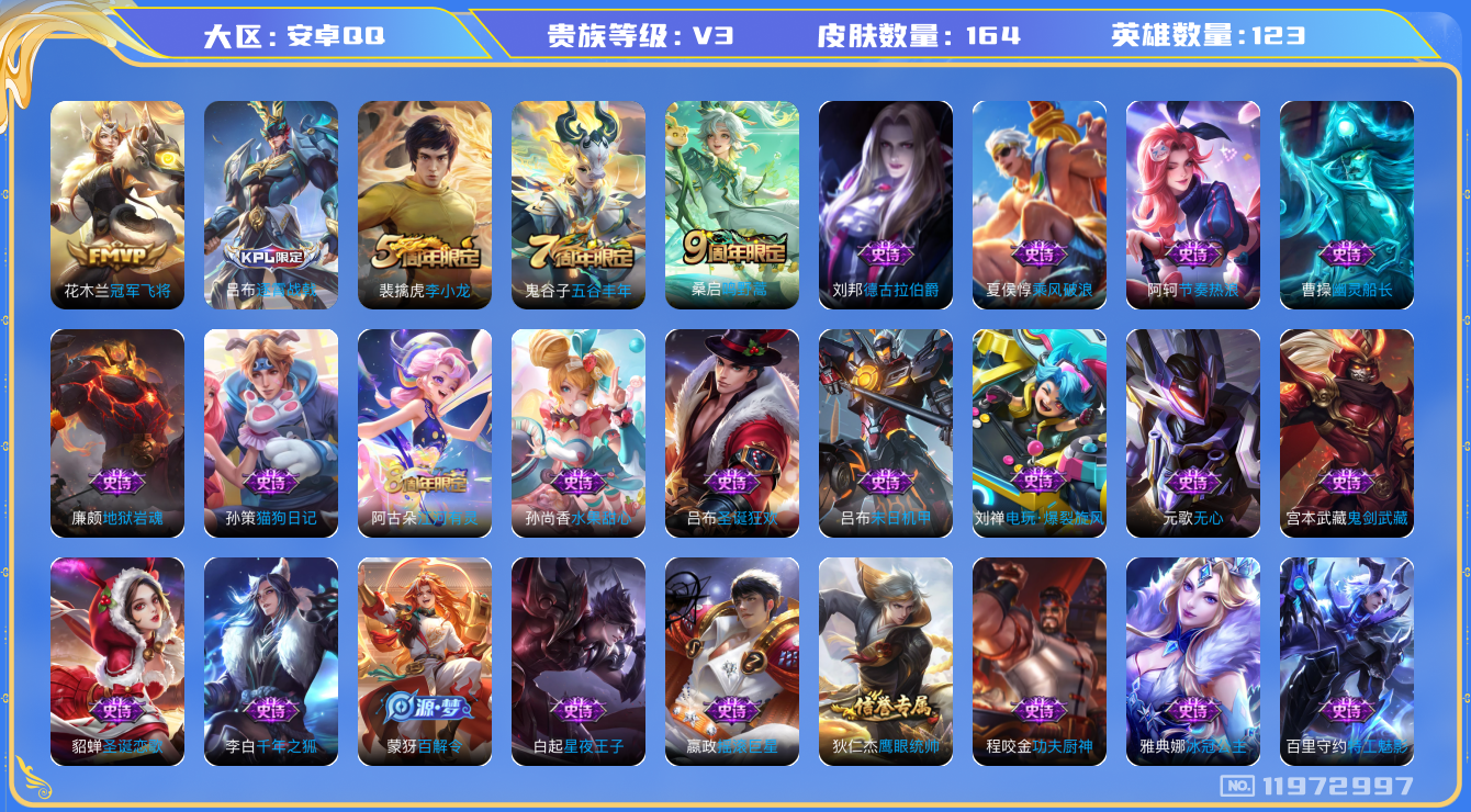 [11972997]V3 2传说 123英雄 164皮肤 可修改实名 优质装备:冠军飞将 珍宝阁皮:蔷薇恋人,玩趣恶龙 限定皮:逐霄战戟,鸣野蒿,五谷丰年,李小龙 史诗皮:特工魅影,千年之狐,江河有灵,百解令(蒙犽),冰冠公主,偶像歌手,电玩·爆裂旋风,末日机甲-吕布,猫狗日记-孙策,节奏热浪,摇滚巨星,水果甜心,星夜王子,功夫厨神,德古拉伯爵,幽灵船长,鬼剑武藏,地狱岩魂,乘风破浪,金属风暴,圣诞狂欢,圣诞恋歌,鹰眼统帅,魅力维加斯,无心