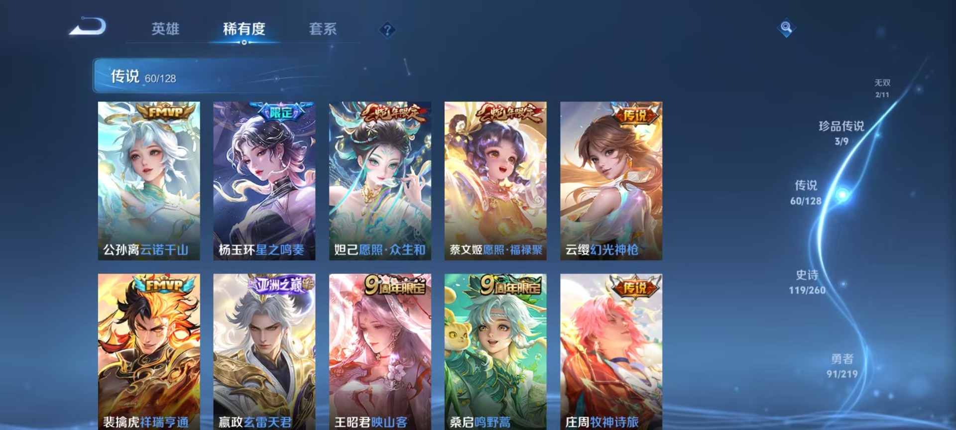 黄忠烈魂,甄姬至美·化雀舞,孙膑寅虎·展翼,李白诗剑行,艾琳陌上桑,桑启鸣野蒿,马超神威,妲己愿照·众生和,墨子降魔,蔡文姬愿照·福禄聚,王昭君映山客,关羽冰锋战神
