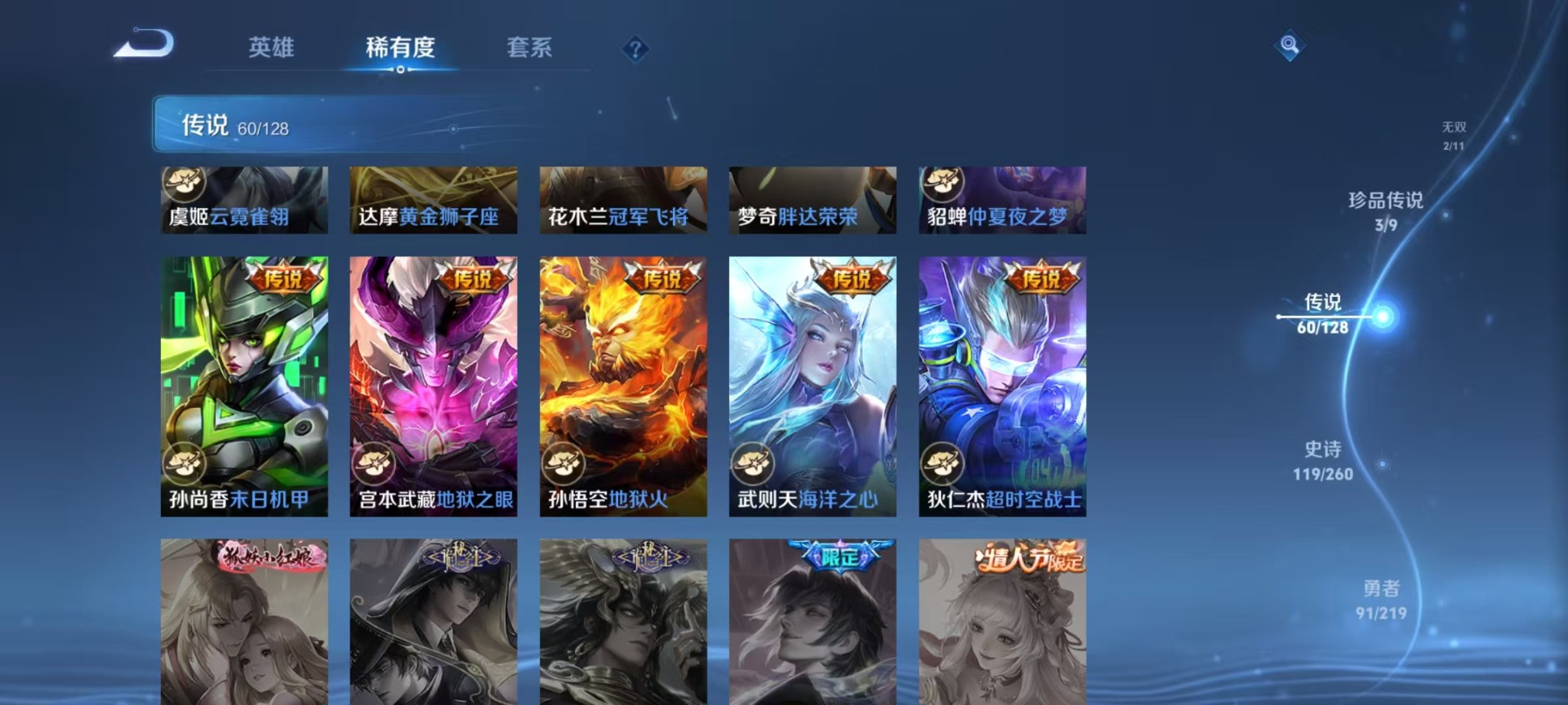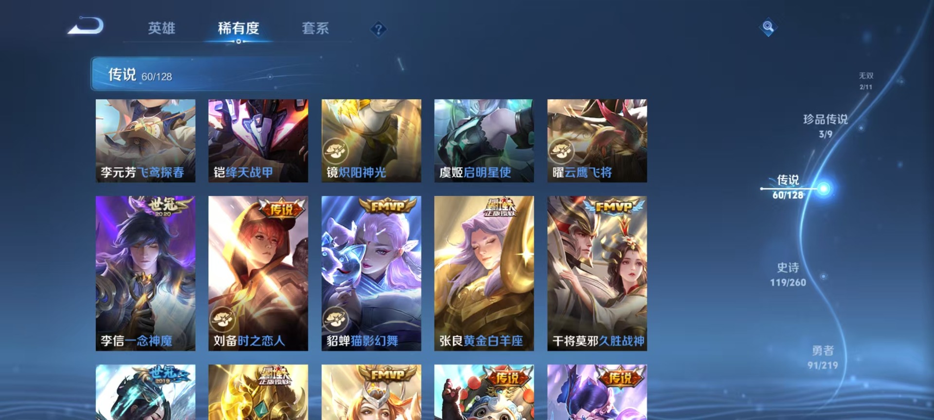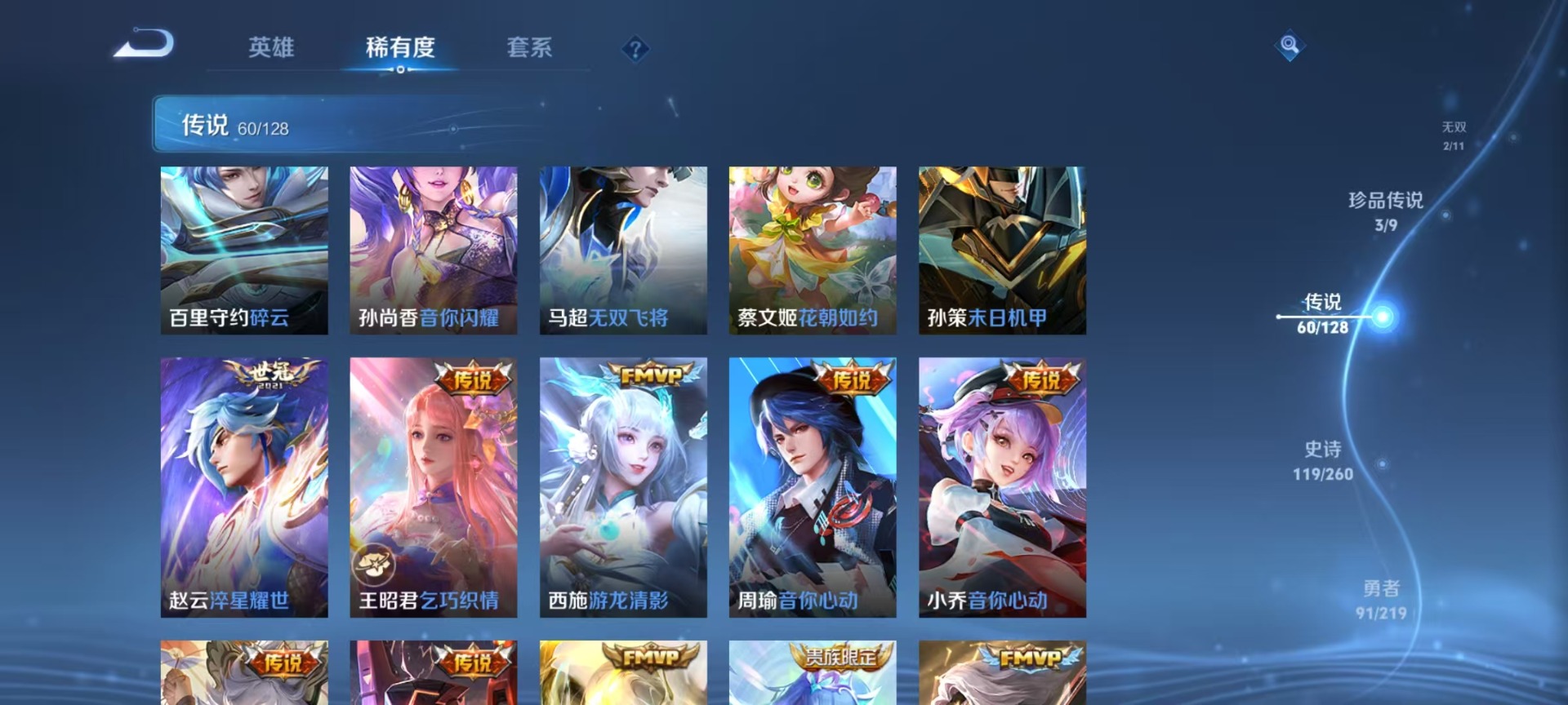 大乔白蛇,大乔猫狗日记,高渐离天秀·音浪,高渐离燃音魔法,刘邦德古拉伯爵,夏侯惇乘风破浪,阿轲暗夜猫娘,阿轲节奏热浪,哪吒雪上飞焰,沈梦溪匿光破解者,铠曙光守护者,曹操幽灵船长,伽罗箭羽风息,廉颇地狱岩魂,小乔缤纷独角兽,小乔青蛇,孙尚香时之恋人,阿古朵顽趣,孙策猫狗日记,不知火舞魅语,海月浮梦罗烟,赵怀真器灵·浮梦炉,鲁班七号电玩小子,吕布圣诞狂欢,露娜紫霞仙子,吕布末日机甲,庄周天秀·幻梦,镜玫瑰异探,镜真我赫兹,诸葛亮黄金分割率,刘禅电玩·爆裂旋风,司马懿暗渊魔法,刘禅天才门将,刘禅绅士熊喵,姜子牙闲日渔趣,姬小满飞车小橘子,宫本武藏鬼剑武藏,杨玉环银翎春语,公孙离无限星赏官,兰陵王暗隐猎兽者,貂蝉圣诞恋歌,貂蝉唤灵魅影,李白谪仙醉月,花木兰水晶猎龙者,夏洛特永昼,李白千年之狐,蒙犽龙鼓争鸣,安琪拉心灵骇客,明世隐夜落电台,安琪拉时之奇旅,艾琳奇遇舞章,杨戬天秀·启明,西施诗语江南,白起星夜王子,白起苍鳞隐世,亚瑟心灵战警,狄仁杰绮世丹青,张良千筹问战,嬴政摇滚巨星,嬴政暗夜贵公子,桑启奇遇星旅,莱西奥末日机甲,程咬金功夫厨神,百里玄策热力回旋,雅典娜冰冠公主,韩信白龙吟,百里守约真我赫兹,李元芳逐浪之夏,墨子龙骑士,墨子金属风暴,蔡文姬舞动绿茵,瑶遇见神鹿,澜赏金猎手,蔡文姬电玩·兔顽号,弈星滕王阁序,娜可露露晚萤,王昭君偶像歌手,钟馗乐园奇幻夜,橘右京修罗