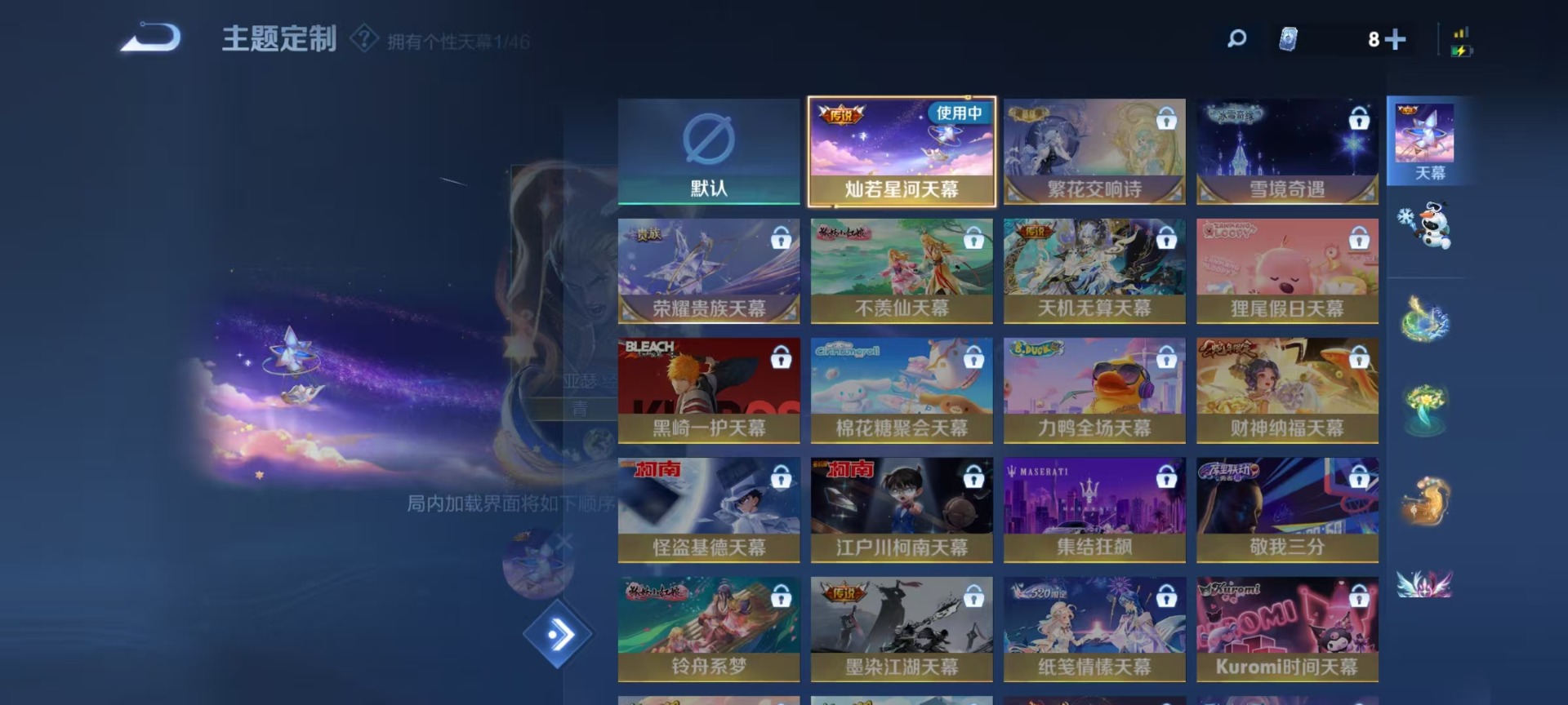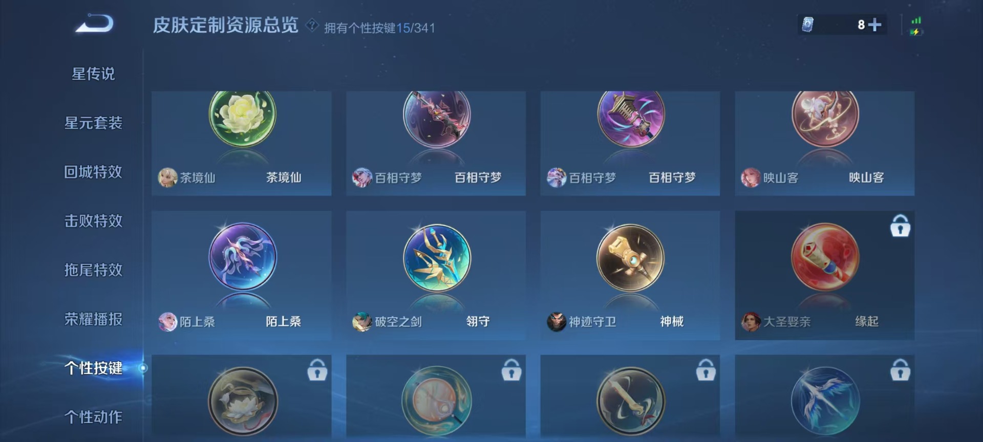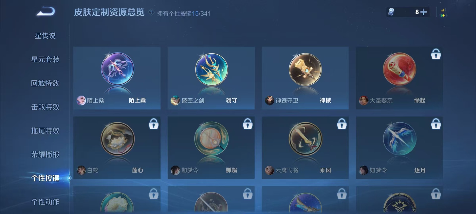 夏侯惇无限飓风号,铠银白咏叹调,小乔天鹅之梦,诸葛亮星域神启,李白鸣剑·曳影,韩信弑枪猎影,瑶拾光映像,虞姬神鉴启示录,貂蝉幻阙歌
